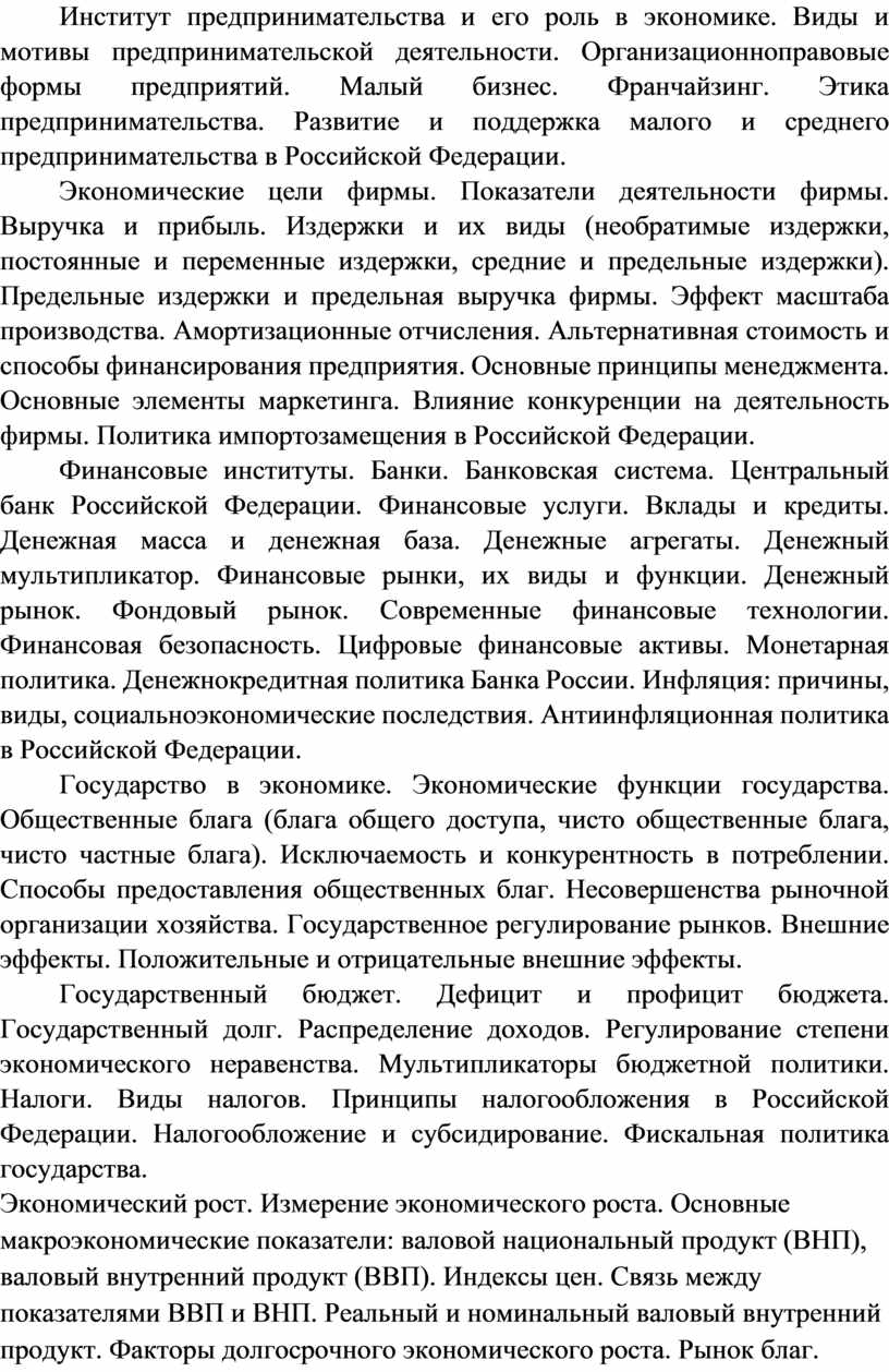 Финансовые институты. Банки. Банковская система. Центральный банк Российской Федерации. Финансовые услуги. Вклады и кредиты. Денежная масса и денежная база. Денежные агрегаты. Денежный мультипликатор. Финансовые рынки, их виды и функции. Денежный рынок. Фондовый рынок. Современные финансовые технологии. Финансовая безопасность. Цифровые финансовые активы. Монетарная политика. Денежнокредитная политика Банка России. Инфляция: причины, виды, социальноэкономические последствия. Антиинфляционная политика в Российской Федерации.