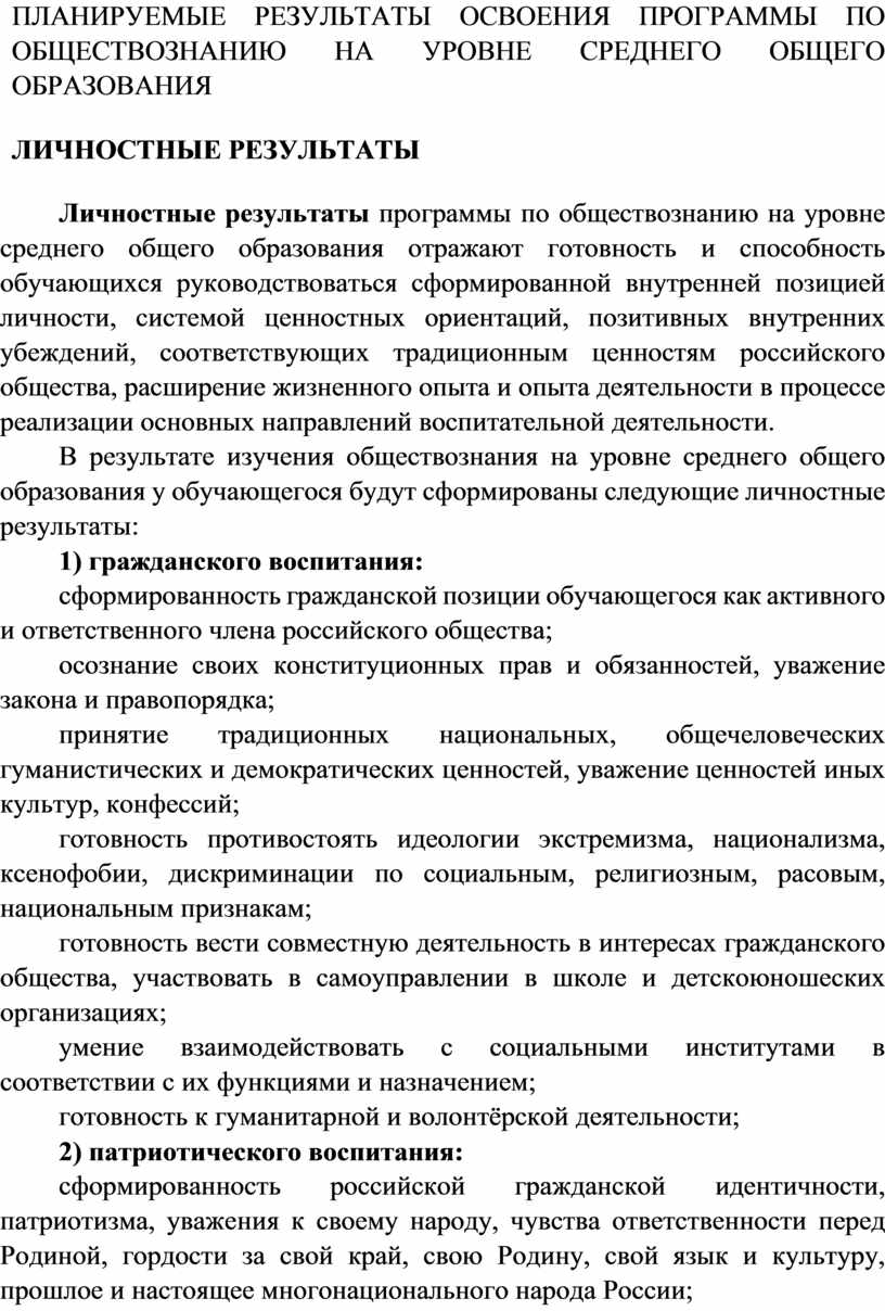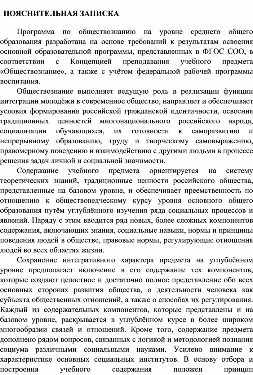 Программа по обществознанию на уровне среднего общего образования разработана на основе требований к результатам освоения основной образовательной программы, представленных в ФГОС СОО, в соответствии с Концепцией преподавания учебного предмета «Обществознание», а также с учётом федеральной рабочей программы воспитания.