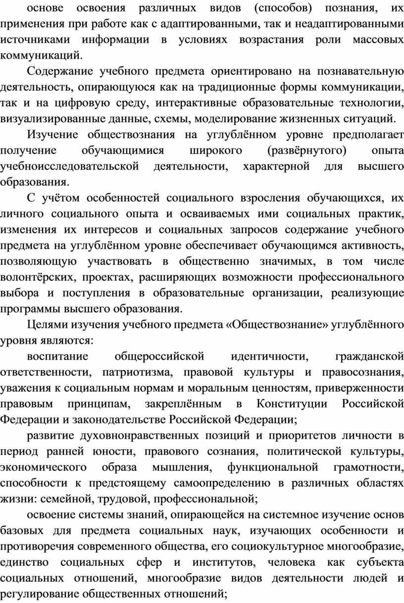 Изучение обществознания на углублённом уровне предполагает получение обучающимися широкого (развёрнутого) опыта учебноисследовательской деятельности, характерной для высшего образования.