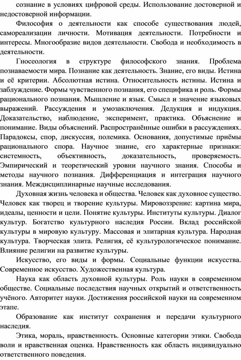 Гносеология в структуре философского знания. Проблема познаваемости мира. Познание как деятельность. Знание, его виды. Истина и её критерии. Абсолютная истина. Относительность истины. Истина и заблуждение. Формы чувственного познания, его специфика и роль. Формы рационального познания. Мышление и язык. Смысл и значение языковых выражений. Рассуждения и умозаключения. Дедукция и индукция. Доказательство, наблюдение, эксперимент, практика. Объяснение и понимание. Виды объяснений. Распространённые ошибки в рассуждениях. Парадоксы, спор, дискуссия, полемика. Основания, допустимые приёмы рационального спора. Научное знание, его характерные признаки: системность, объективность, доказательность, проверяемость. Эмпирический и теоретический уровни научного знания. Способы и методы научного познания. Дифференциация и интеграция научного знания. Междисциплинарные научные исследования.