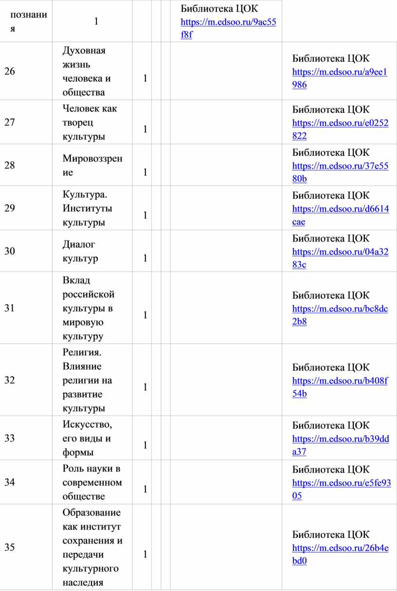 Духовная жизнь человека и общества. Человек как духовное существо. Человек как творец и творение культуры. Мировоззрение: картина мира, идеалы, ценности и цели. Понятие культуры. Институты культуры. Диалог культур. Богатство культурного наследия России. Вклад российской культуры в мировую культуру. Массовая и элитарная культура. Народная культура. Творческая элита. Религия, её культурологическое понимание. Влияние религии на развитие культуры.