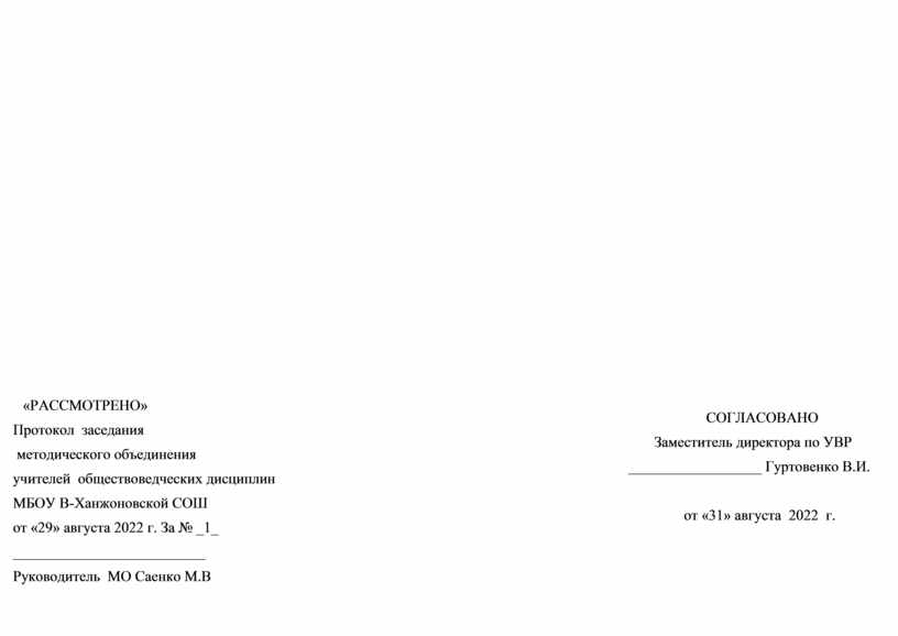 «РАССМОТРЕНО» Протокол заседания методического объединения учителей обществоведческих дисциплин МБОУ В-Ханжоновской СОШ от «29» августа 2022 г. За № _1_ __________________________ Руководитель МО Саенко М.В