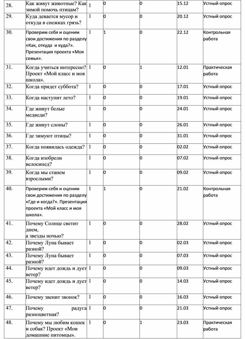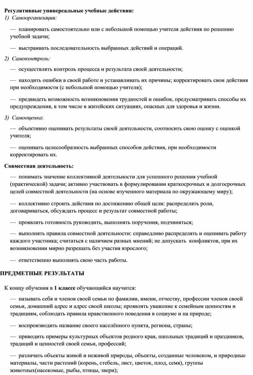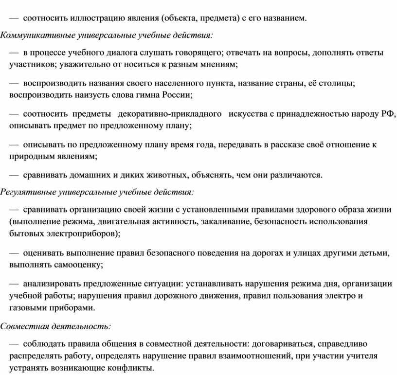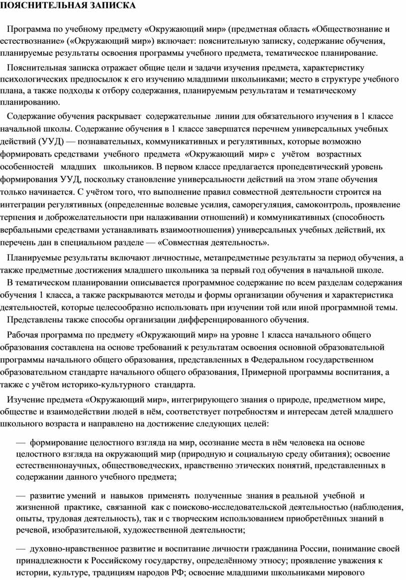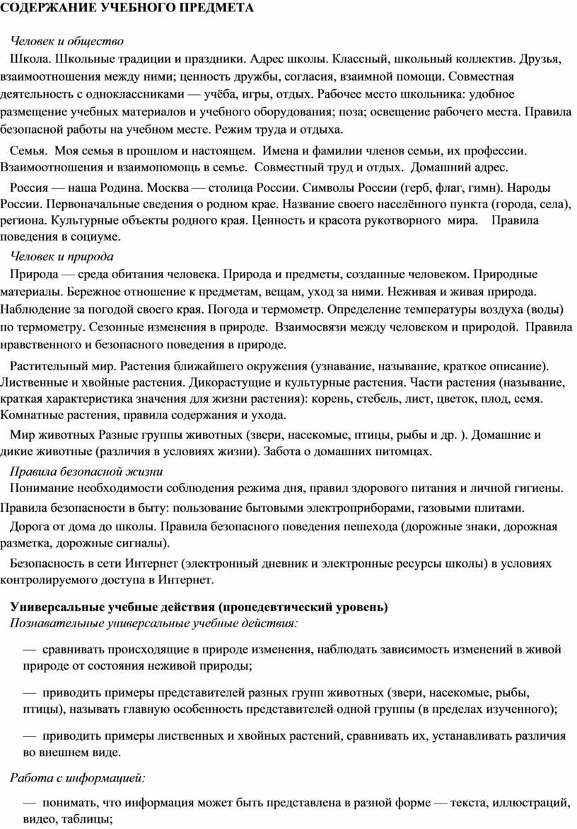 Содержание обучения раскрывает содержательные линии для обязательного изучения в 1 классе начальной школы. Содержание обучения в 1 классе завершатся перечнем универсальных учебных действий (УУД) — познавательных, коммуникативных и регулятивных, которые возможно формировать средствами учебного предмета «Окружающий мир» с учётом возрастных особенностей младших школьников. В первом классе предлагается пропедевтический уровень формирования УУД, поскольку становление универсальности действий на этом этапе обучения только начинается. С учётом того, что выполнение правил совместной деятельности строится на интеграции регулятивных (определенные волевые усилия, саморегуляция, самоконтроль, проявление терпения и доброжелательности при налаживании отношений) и коммуникативных (способность вербальными средствами устанавливать взаимоотношения) универсальных учебных действий, их перечень дан в специальном разделе — «Совместная деятельность».