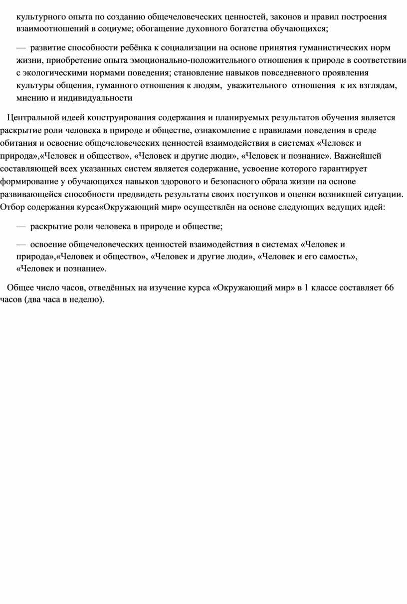 Центральной идеей конструирования содержания и планируемых результатов обучения является раскрытие роли человека в природе и обществе, ознакомление с правилами поведения в среде обитания и освоение общечеловеческих ценностей взаимодействия в системах «Человек и природа»,«Человек и общество», «Человек и другие люди», «Человек и познание». Важнейшей составляющей всех указанных систем является содержание, усвоение которого гарантирует формирование у обучающихся навыков здорового и безопасного образа жизни на основе развивающейся способности предвидеть результаты своих поступков и оценки возникшей ситуации. Отбор содержания курса«Окружающий мир» осуществлён на основе следующих ведущих идей: