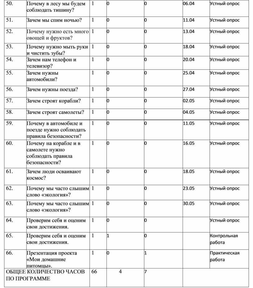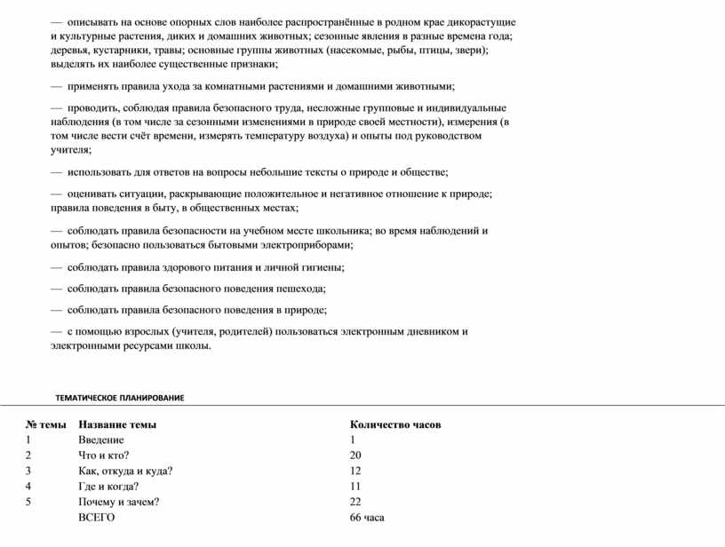 Общее число часов, отведённых на изучение курса «Окружающий мир» в 1 классе составляет 66 часов (два часа в неделю).