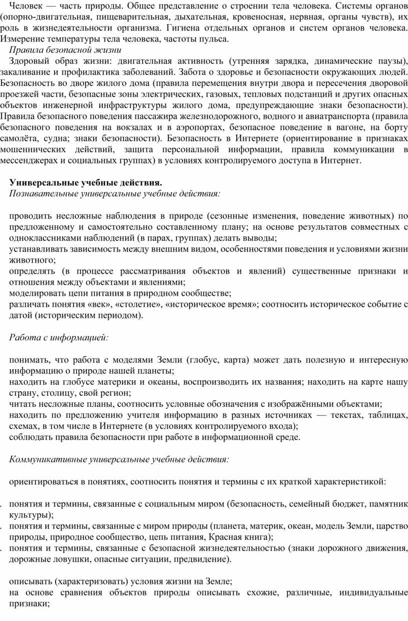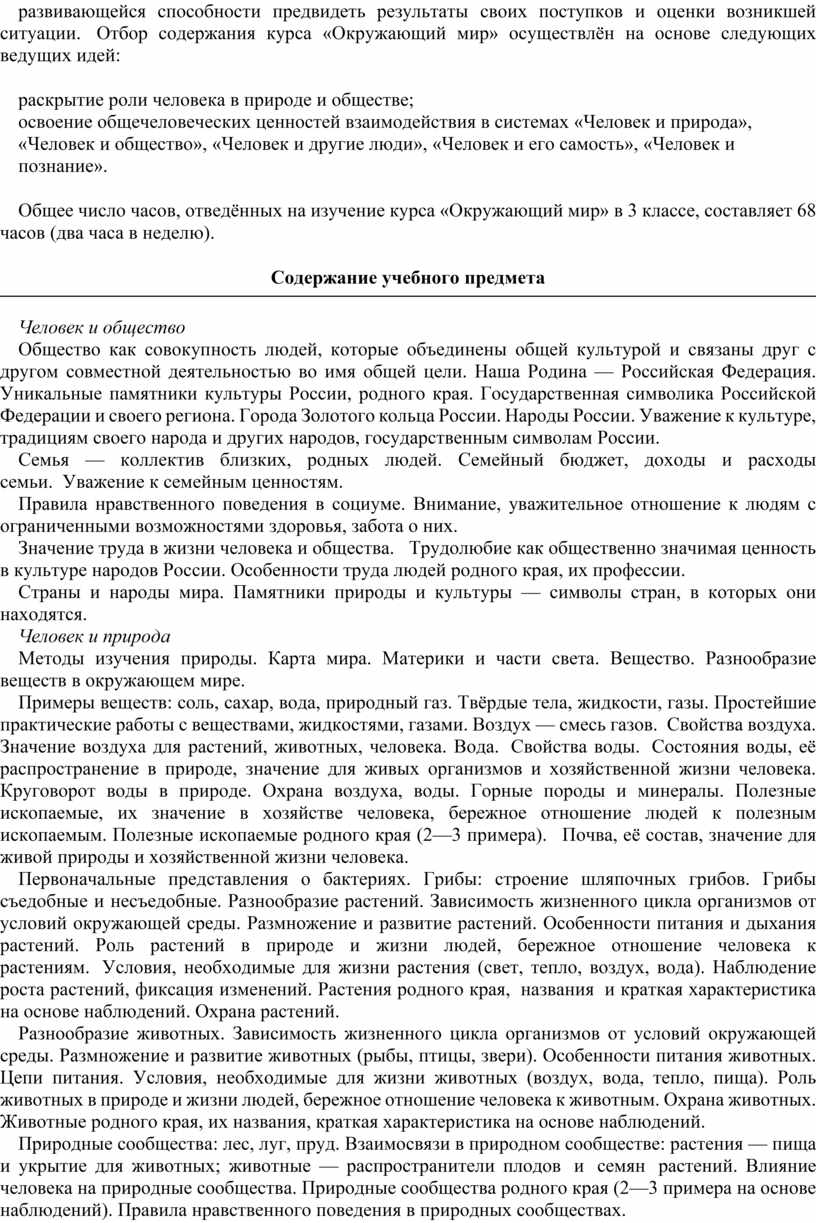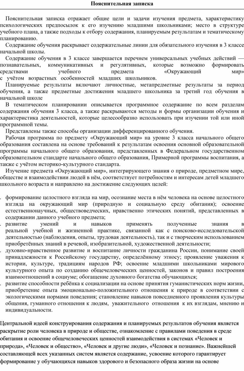Центральной идеей конструирования содержания и планируемых результатов обучения является раскрытие роли человека в природе и обществе, ознакомление с правилами поведения в среде обитания и освоение общечеловеческих ценностей взаимодействия в системах «Человек и природа», «Человек и общество», «Человек и другие люди», «Человек и познание». Важнейшей составляющей всех указанных систем является содержание, усвоение которого гарантирует формирование у обучающихся навыков здорового и безопасного образа жизни на основе развивающейся способности предвидеть результаты своих поступков и оценки возникшей ситуации. Отбор содержания курса «Окружающий мир» осуществлён на основе следующих ведущих идей: