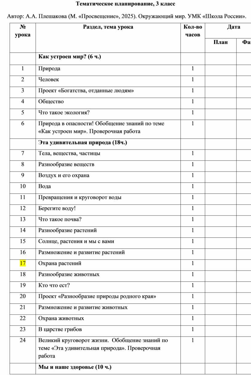 Общее число часов, отведённых на изучение курса «Окружающий мир» в 3 классе, составляет 68 часов (два часа в неделю).