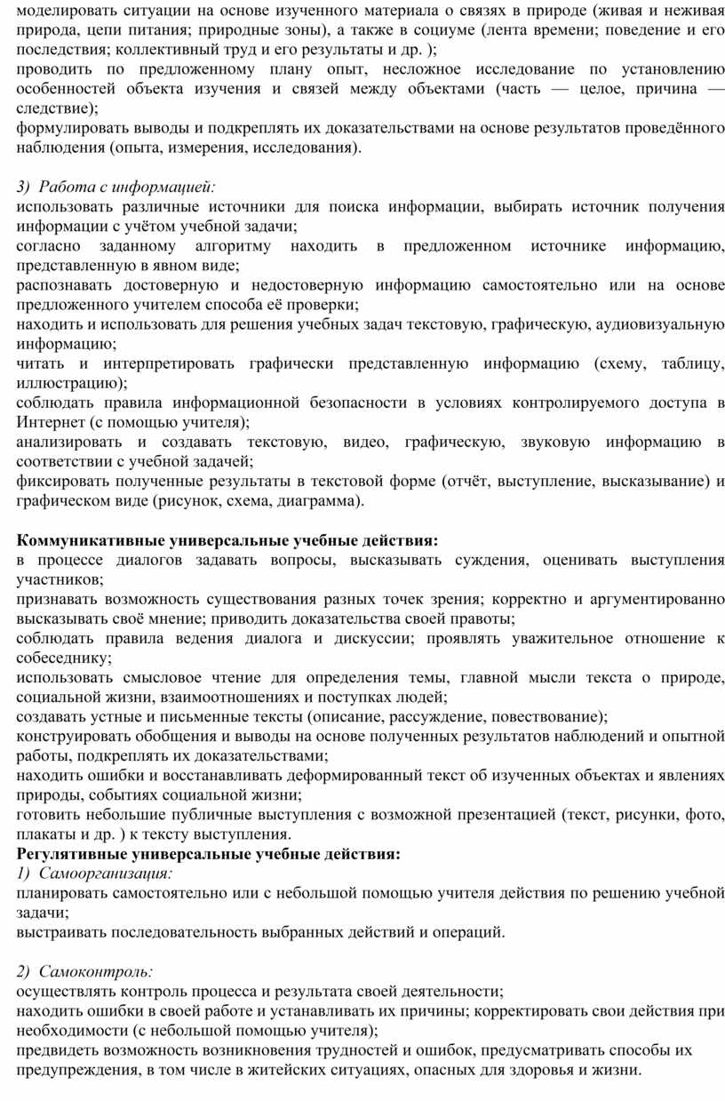 Содержание обучения в 3 классе завершается перечнем универсальных учебных действий — познавательных, коммуникативных и регулятивных, которые возможно формировать средствами учебного предмета «Окружающий мир» с учётом возрастных особенностей младших школьников.