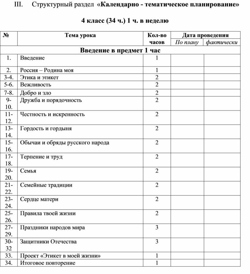 Тематическое планирование 4 класс (34 урока в год/1 час в неделю)
