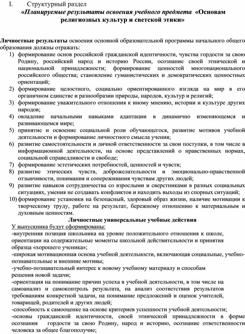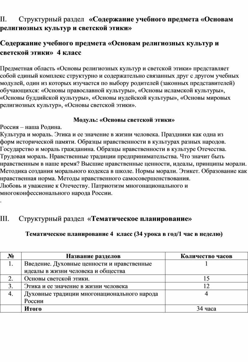 II. Структурный раздел «Содержание учебного предмета «Основам религиозных культур и светской этики»