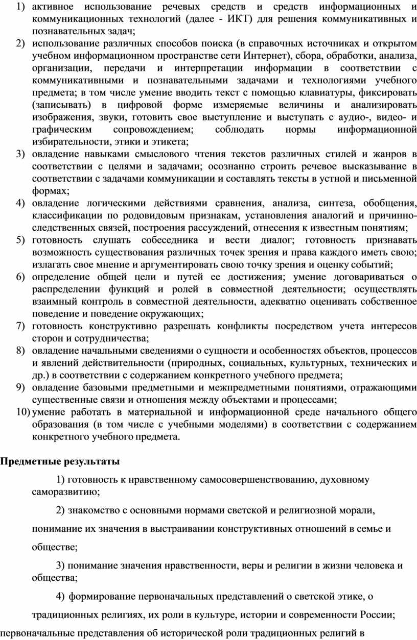 «Планируемые результаты освоения учебного предмета «Основам религиозных культур и светской этики»