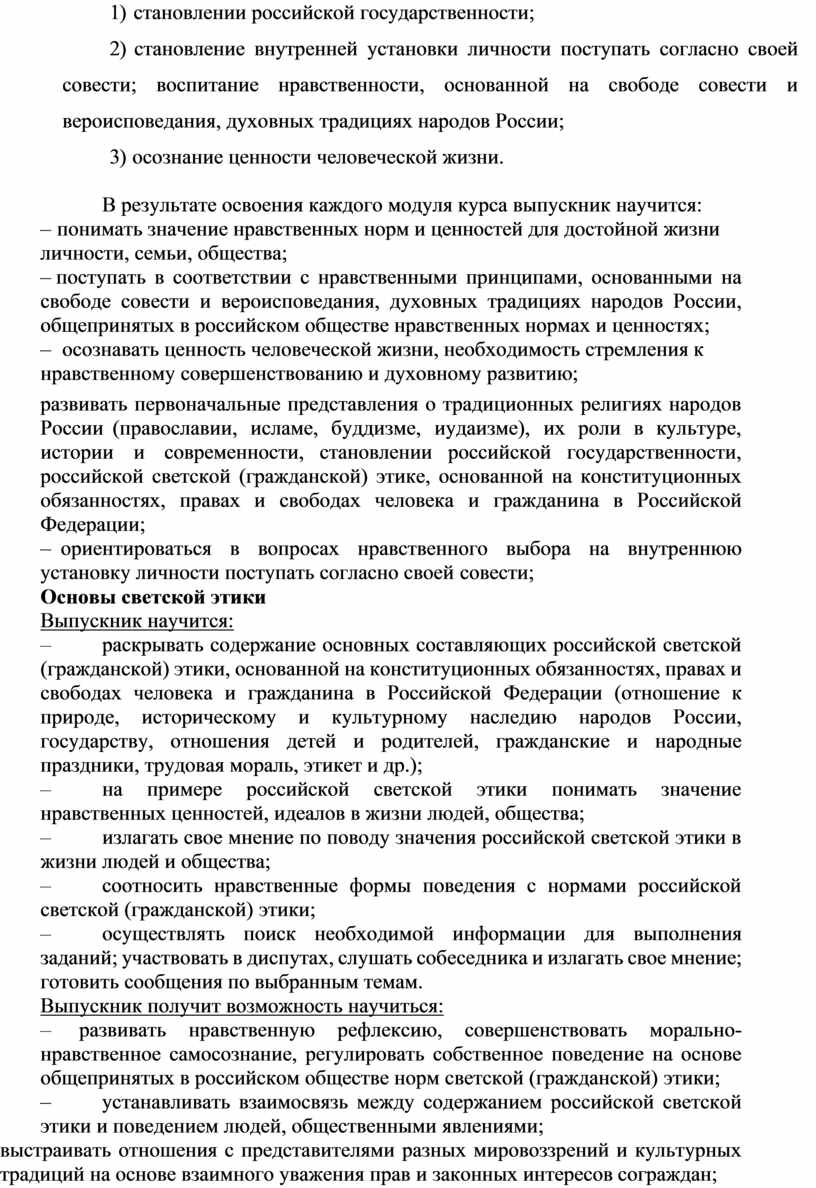 развивать первоначальные представления о традиционных религиях народов России (православии, исламе, буддизме, иудаизме), их роли в культуре, истории и современности, становлении российской государственности, российской светской (гражданской) этике, основанной на конституционных обязанностях, правах и свободах человека и гражданина в Российской Федерации;