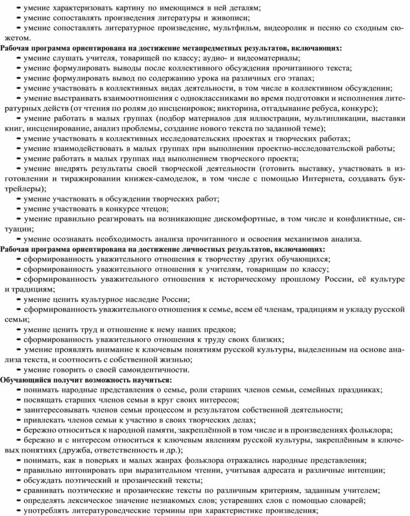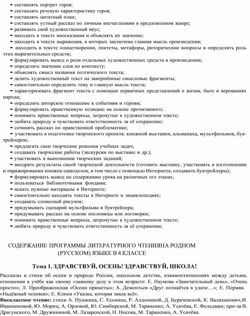 — создание первичных представлений о русской литературе как о национальном достоянии. В задачи предмета «Литературное чтение на родном (русском) языке. 1–4 классы» входит: