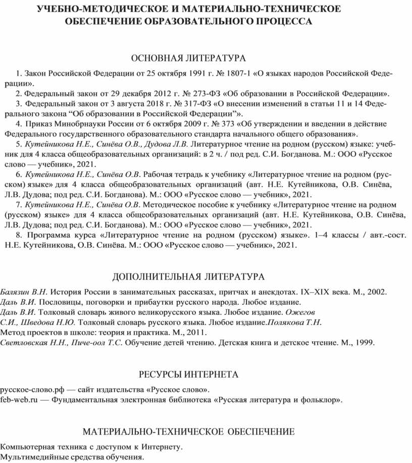 5. Кутейникова Н.Е., Синёва О.В., Дудова Л.В. Литературное чтение на родном (русском) языке: учеб- ник для 4 класса общеобразовательных организаций: в 2 ч. / под ред. С.И. Богданова. М.: ООО «Русское слово — учебник», 2021.