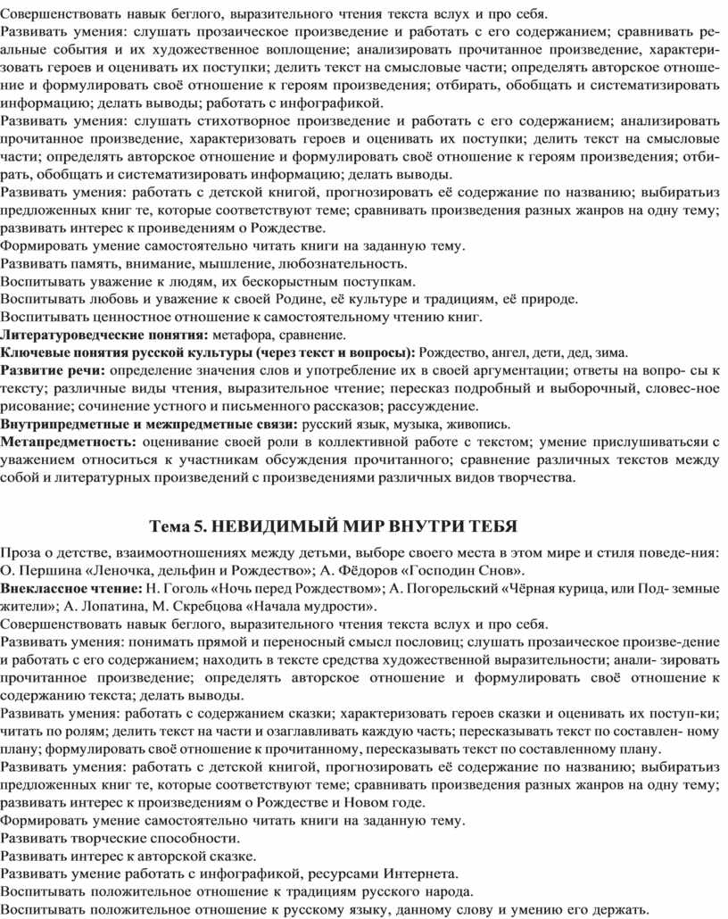 Внеклассное чтение: Н. Гоголь «Ночь перед Рождеством»; А. Погорельский «Чёрная курица, или Под- земные жители»; А. Лопатина, М. Скребцова «Начала мудрости».