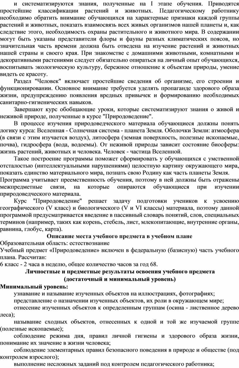 При изучении раздела «Растительный мир» и раздела «Животный мир» углубляются и систематизируются знания, полученные на I этапе обучения. Приводятся простейшие классификации растений и животных. Педагогическому работнику необходимо обратить внимание обучающихся на характерные признаки каждой группы растений и животных, показать взаимосвязь всех живых организмов нашей планеты и, как следствие этого, необходимость охраны растительного и животного мира. В содержании могут быть указаны представители флоры и фауны разных климатических поясов, но значительная часть времени должна быть отведена на изучение растений и животных нашей страны и своего края. При знакомстве с домашними животными, комнатными и декоративными растениями следует обязательно опираться на личный опыт обучающихся, воспитывать экологическую культуру, бережное отношение к объектам природы, умение видеть ее красоту.