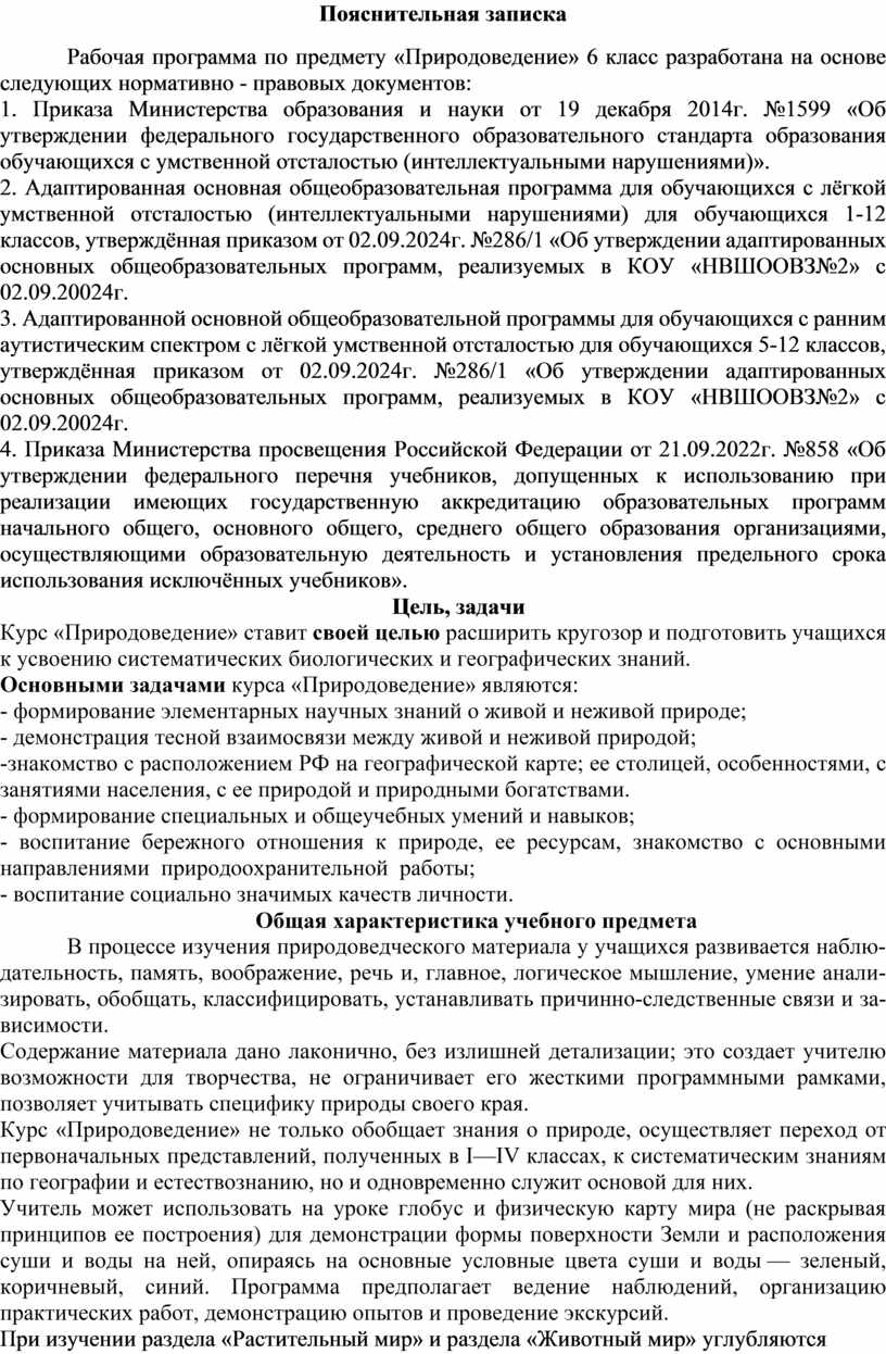 Рабочая программа по предмету «Природоведение» 6 класс разработана на основе следующих нормативно - правовых документов: