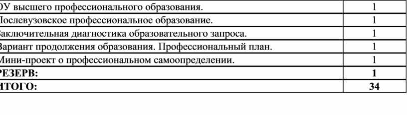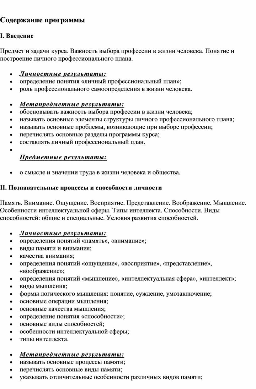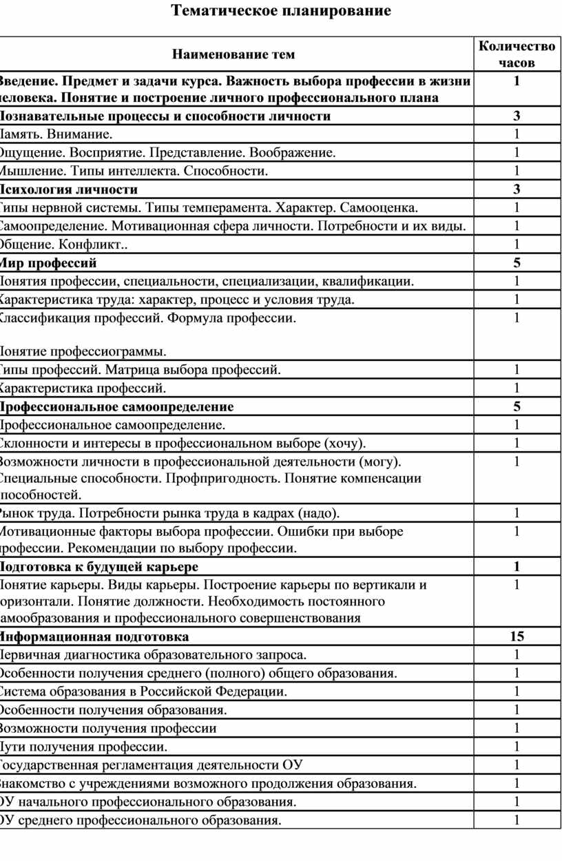 Гл.1 Введение. Предмет и задачи курса. Важность выбора профессии в жизни человека. Понятие и построение личного профессионального плана 1ч Гл.2 Познавательные процессы и способности личности 3ч Гл. 3 Психология личности 3ч Гл.4 Мир профессий 5ч Гл.5 Профессиональное самоопределение 5ч Гл.6 Подготовка к будущей карьере 1ч Гл.7 Информационная подготовка 15 Гл.8 Резерв 1ч |