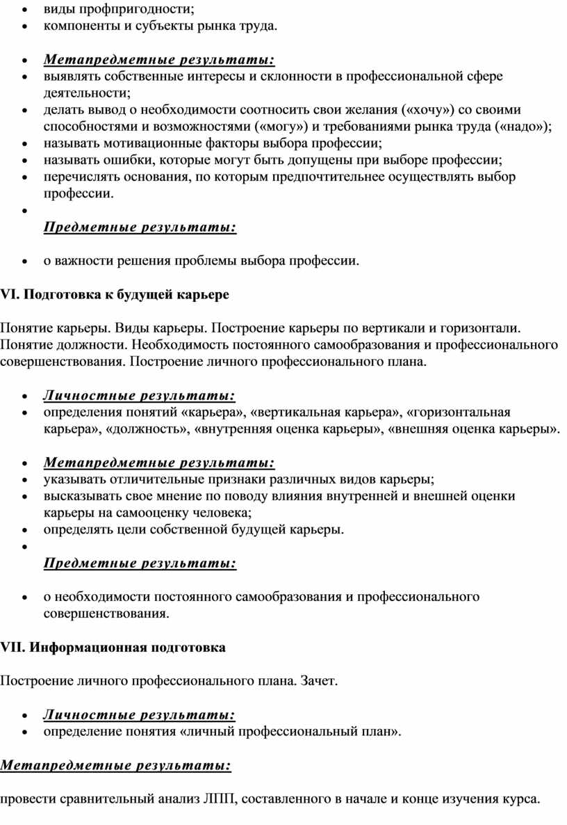 составлению личного профессионального плана; правила выбора профессии; понятие