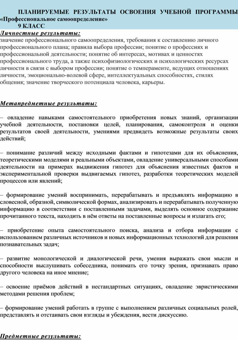 ПЛАНИРУЕМЫЕ РЕЗУЛЬТАТЫ ОСВОЕНИЯ УЧЕБНОЙ ПРОГРАММЫ «Профессиональное самоопределение»