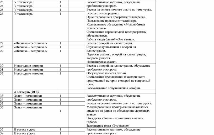 Рассматривание картинок, обсуждение проблемного вопроса. Беседа на основе личного опыта по теме урока. Беседа о телепередачах. Ориентирование в программе телепередач. Пользование пультом от телевизора. Коллективное обсуждение «Моя любимая телепередача». Составление персональной телепрограммы обучающегося. Работа над рубликой «Это важно». |