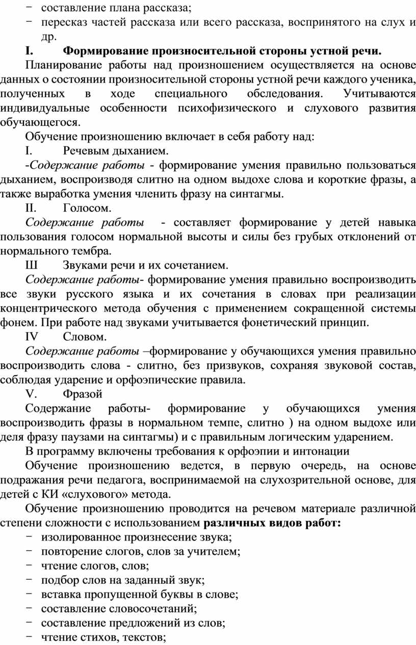 В рабочей программе представлено тематическое планирование по развитию слухового восприятия и формированию произношения, учитывающее индивидуальные слуховые возможности и речевое развитие каждого учащегося и предусматривающее индивидуальный подход на занятиях к каждому учащемуся.