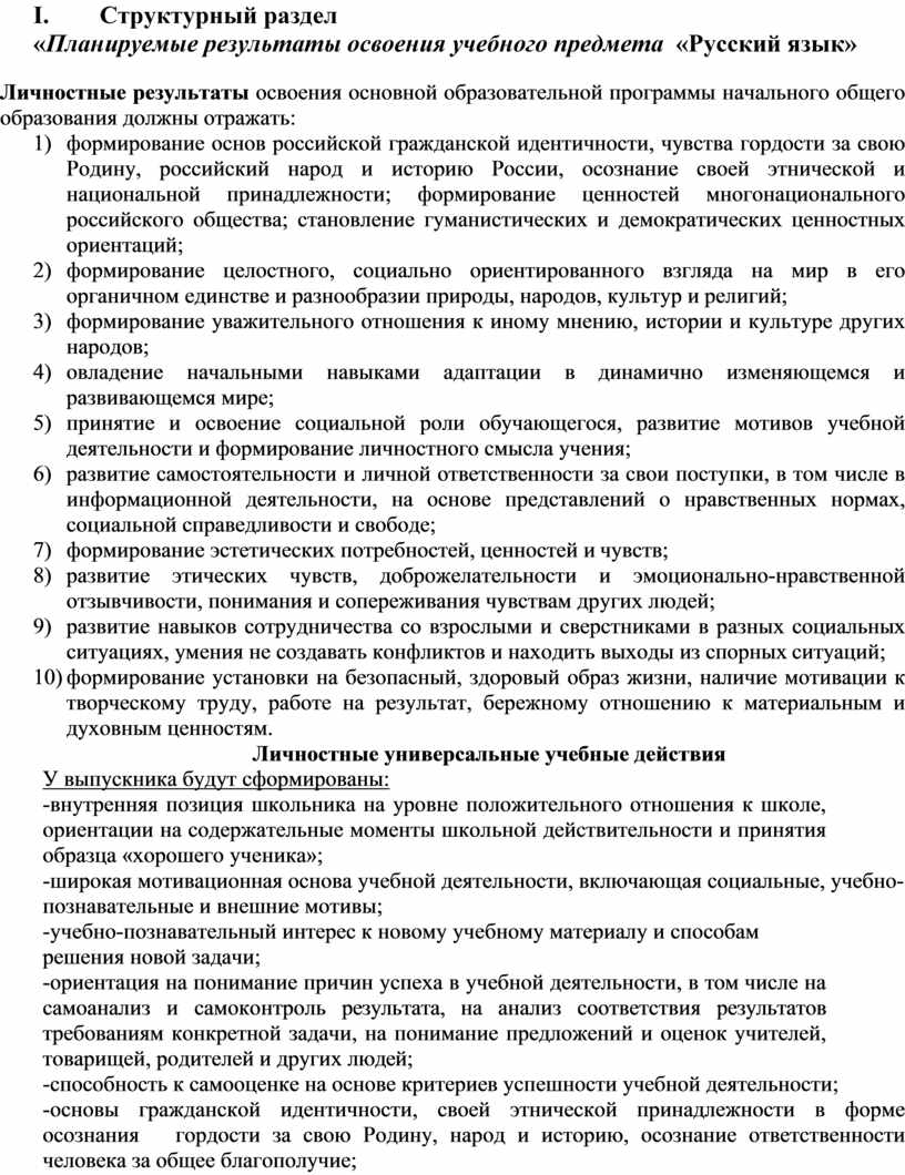 «Планируемые результаты освоения учебного предмета «Русский язык»
