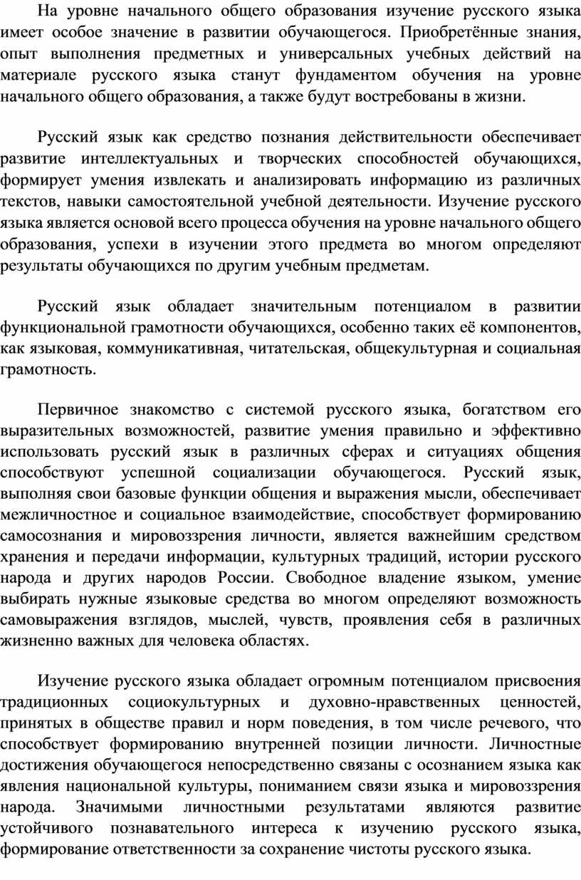 На уровне начального общего образования изучение русского языка имеет особое значение в развитии обучающегося. Приобретённые знания, опыт выполнения предметных и универсальных учебных действий на материале русского языка станут фундаментом обучения на уровне начального общего образования, а также будут востребованы в жизни.