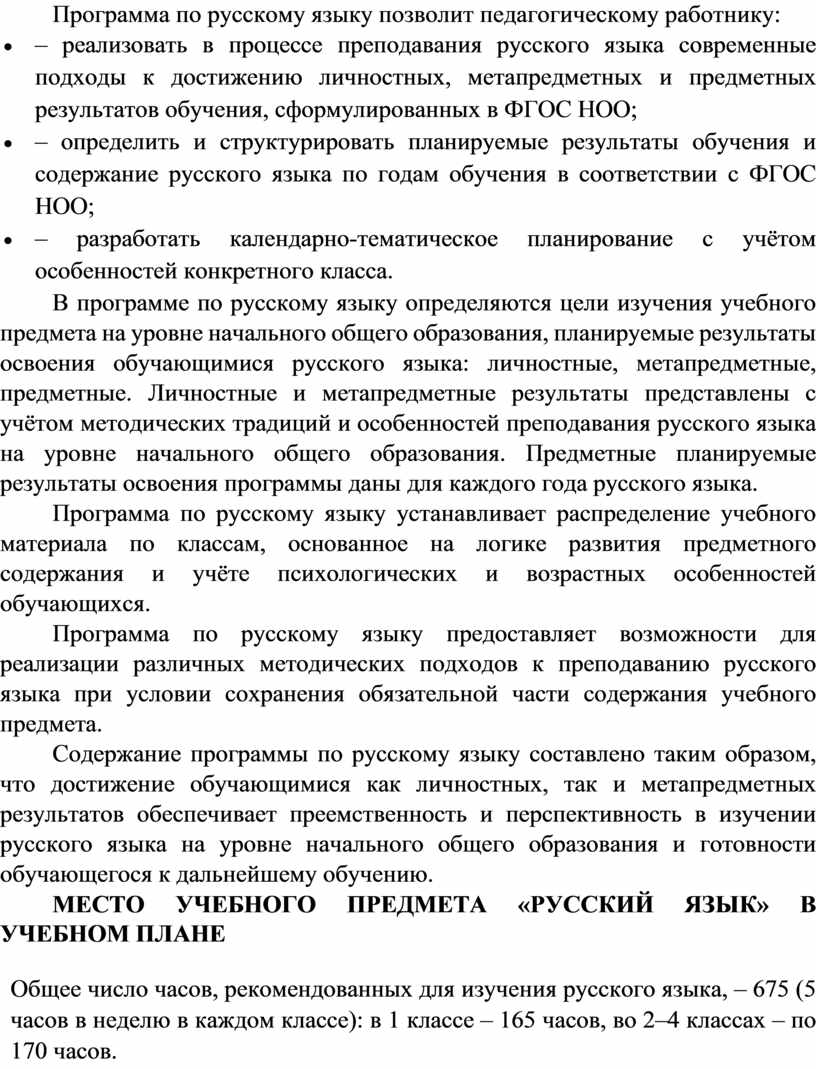 Программа по русскому языку предоставляет возможности для реализации различных методических подходов к преподаванию русского языка при условии сохранения обязательной части содержания учебного предмета.