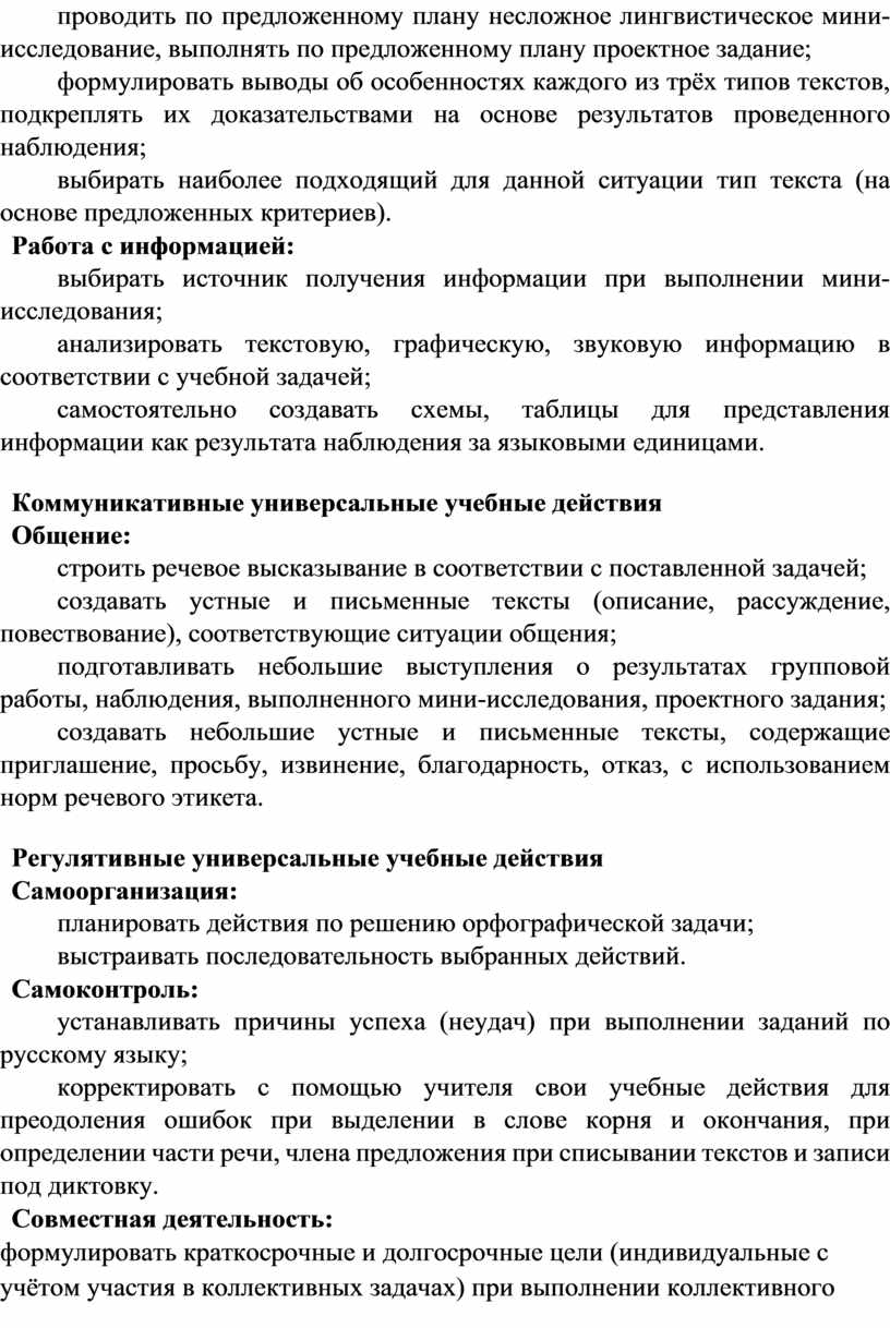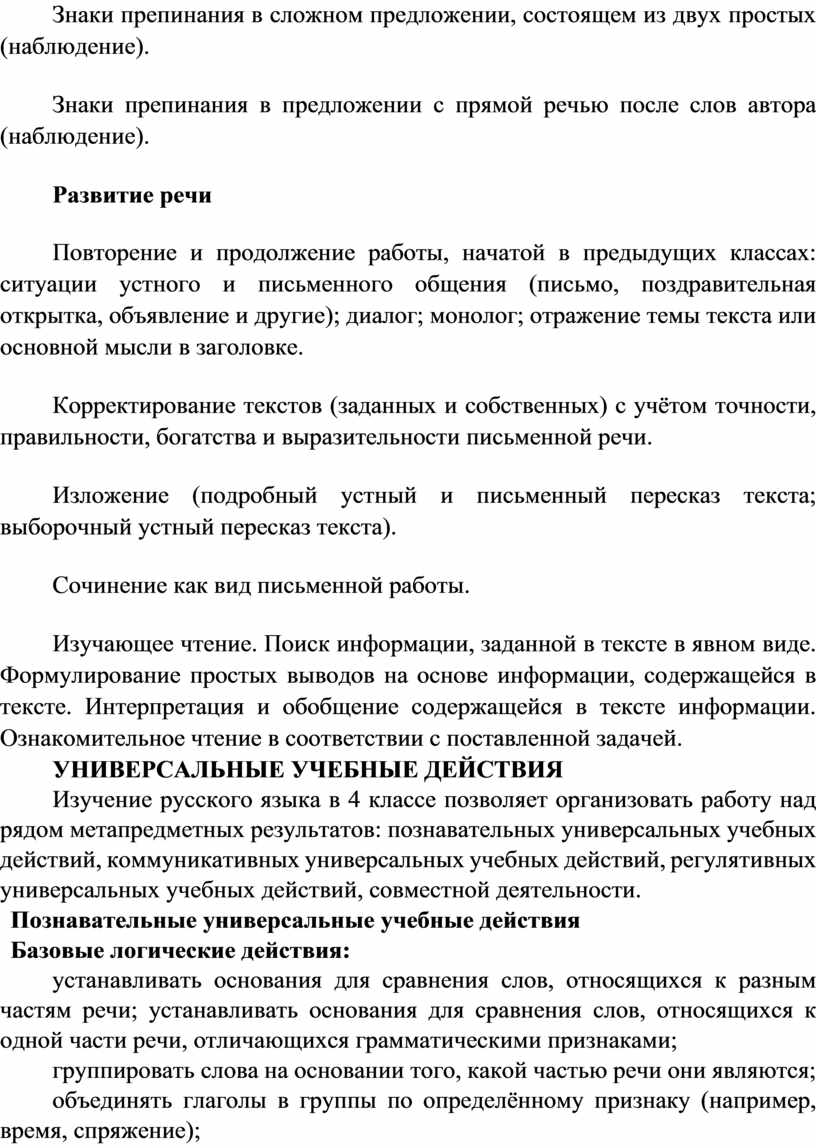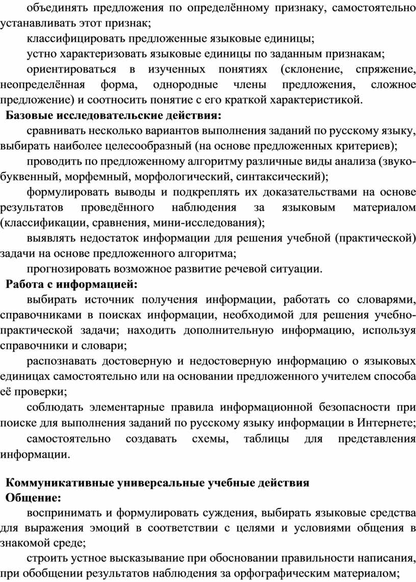 Содержание обучения раскрывает содержательные линии, которые предлагаются для обязательного изучения в каждом классе на уровне начального общего образования. Содержание обучения в каждом классе завершается перечнем универсальных учебных действий – познавательных, коммуникативных и регулятивных, которые возможно формировать средствами русского языка с учётом возрастных особенностей обучающихся на уровне начального общего образования.
