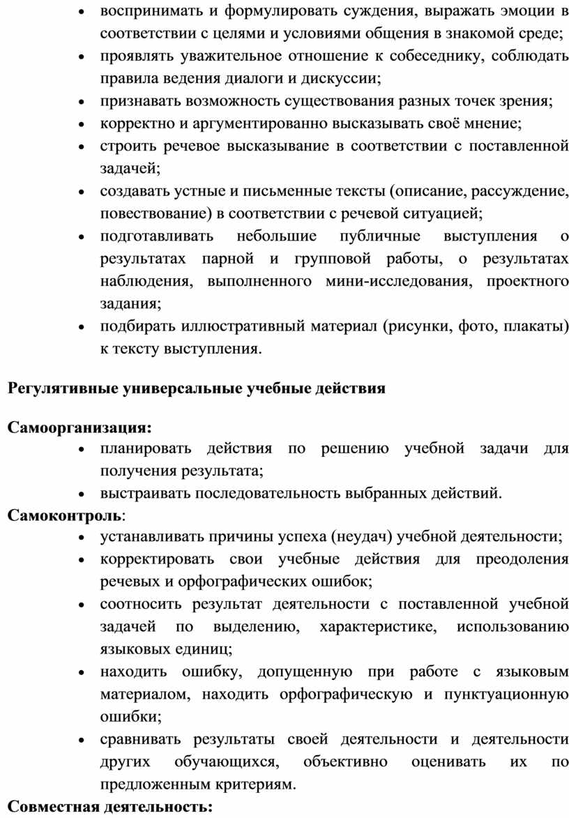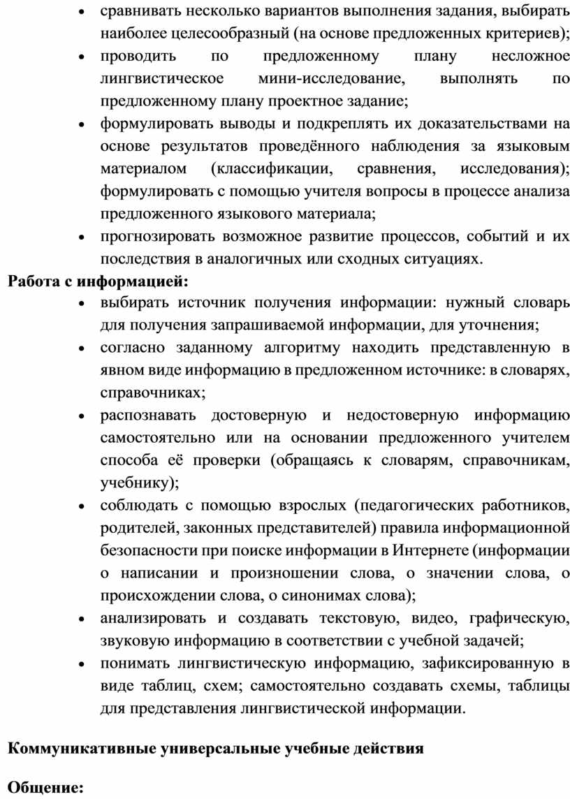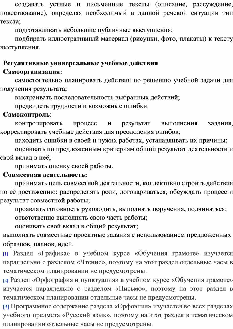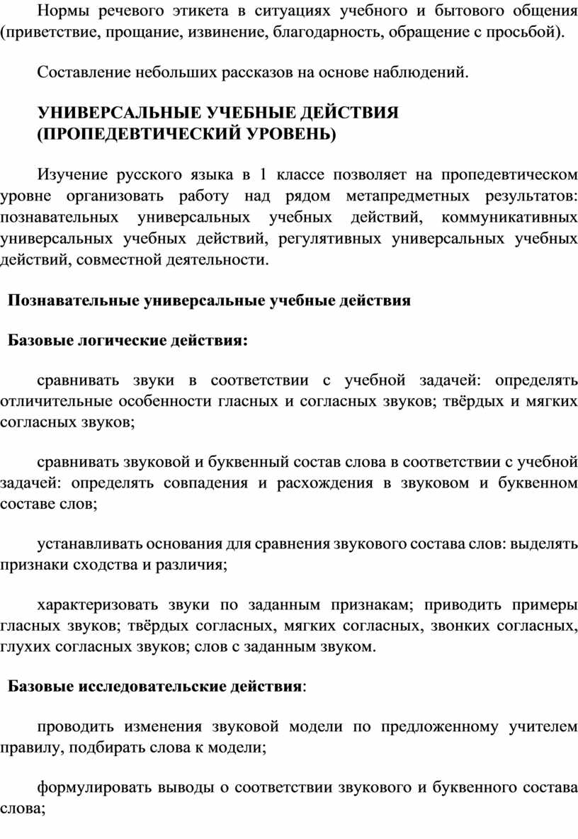 Содержание обучения раскрывает содержательные линии, которые предлагаются для обязательного изучения в каждом классе на уровне начального общего образования. Содержание обучения в каждом классе завершается перечнем универсальных учебных действий – познавательных, коммуникативных и регулятивных, которые возможно формировать средствами русского языка с учётом возрастных особенностей обучающихся на уровне начального общего образования.