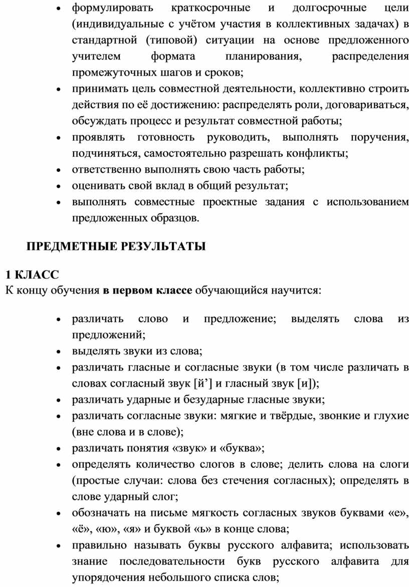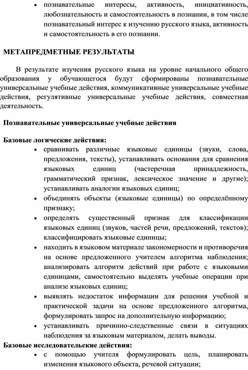 В программе по русскому языку определяются цели изучения учебного предмета на уровне начального общего образования, планируемые результаты освоения обучающимися русского языка: личностные, метапредметные, предметные. Личностные и метапредметные результаты представлены с учётом методических традиций и особенностей преподавания русского языка на уровне начального общего образования. Предметные планируемые результаты освоения программы даны для каждого года русского языка.