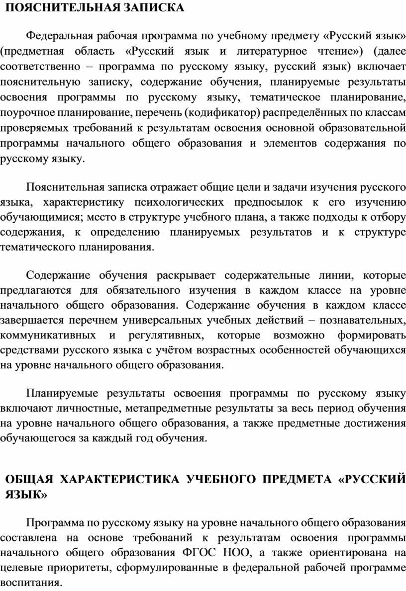 Федеральная рабочая программа по учебному предмету «Русский язык» (предметная область «Русский язык и литературное чтение») (далее соответственно – программа по русскому языку, русский язык) включает пояснительную записку, содержание обучения, планируемые результаты освоения программы по русскому языку, тематическое планирование, поурочное планирование, перечень (кодификатор) распределённых по классам проверяемых требований к результатам освоения основной образовательной программы начального общего образования и элементов содержания по русскому языку.