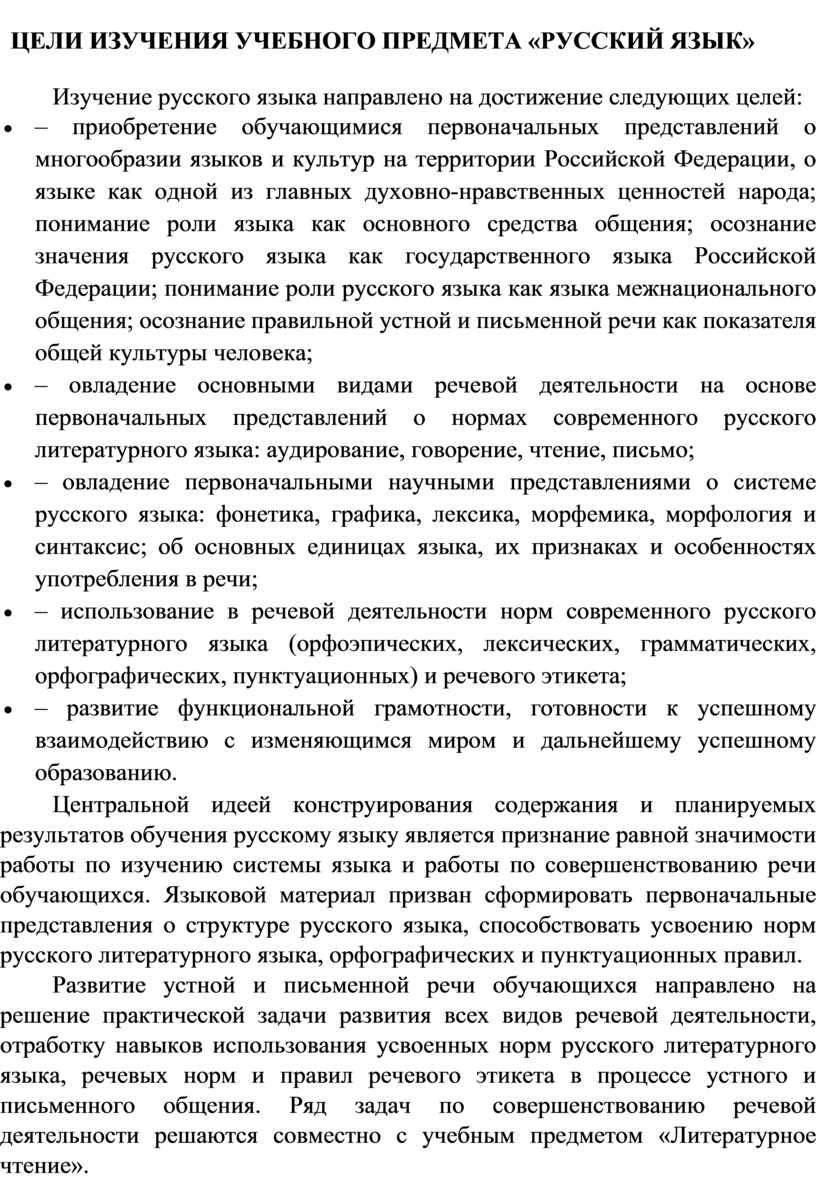 Центральной идеей конструирования содержания и планируемых результатов обучения русскому языку является признание равной значимости работы по изучению системы языка и работы по совершенствованию речи обучающихся. Языковой материал призван сформировать первоначальные представления о структуре русского языка, способствовать усвоению норм русского литературного языка, орфографических и пунктуационных правил.