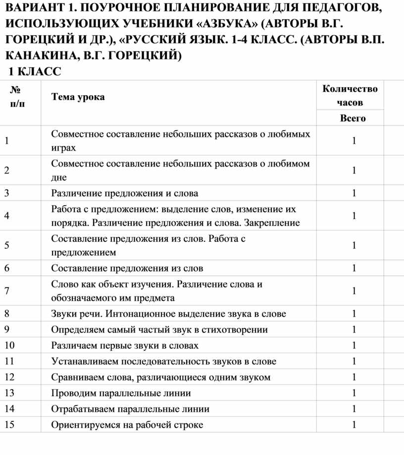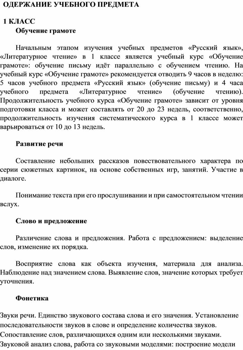 Начальным этапом изучения учебных предметов «Русский язык», «Литературное чтение» в 1 классе является учебный курс «Обучение грамоте»: обучение письму идёт параллельно с обучением чтению. На учебный курс «Обучение грамоте» рекомендуется отводить 9 часов в неделю: 5 часов учебного предмета «Русский язык» (обучение письму) и 4 часа учебного предмета «Литературное чтение» (обучение чтению). Продолжительность учебного курса «Обучение грамоте» зависит от уровня подготовки класса и может составлять от 20 до 23 недель, соответственно, продолжительность изучения систематического курса в 1 классе может варьироваться от 10 до 13 недель.