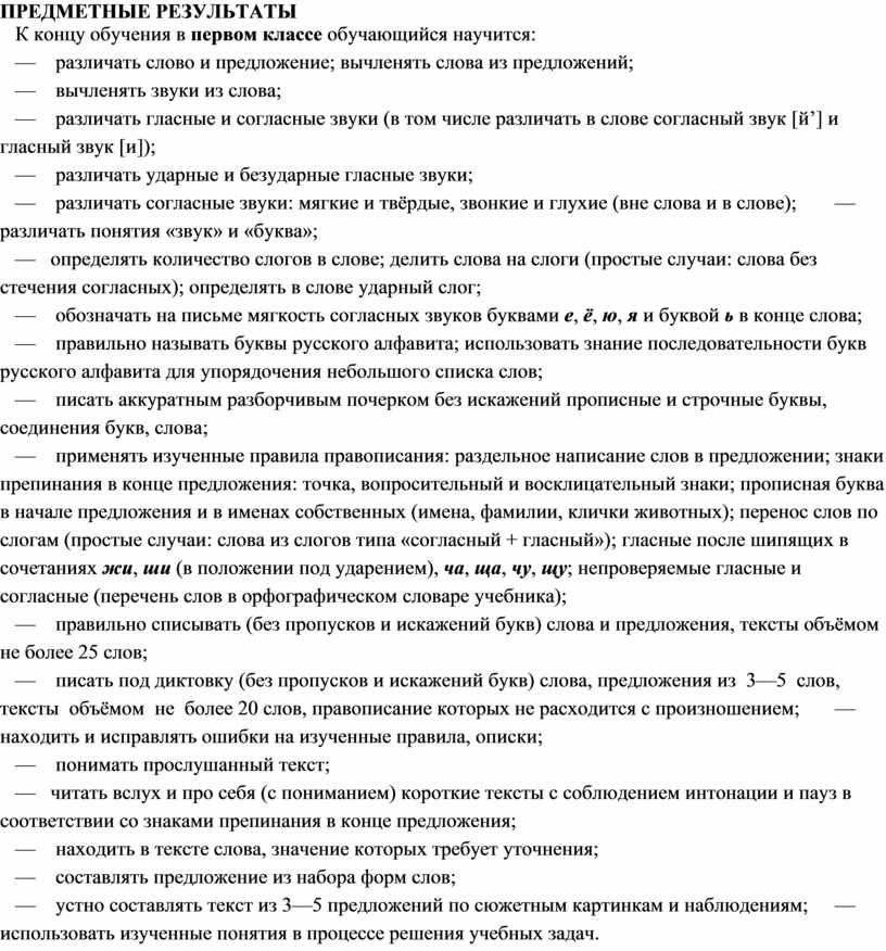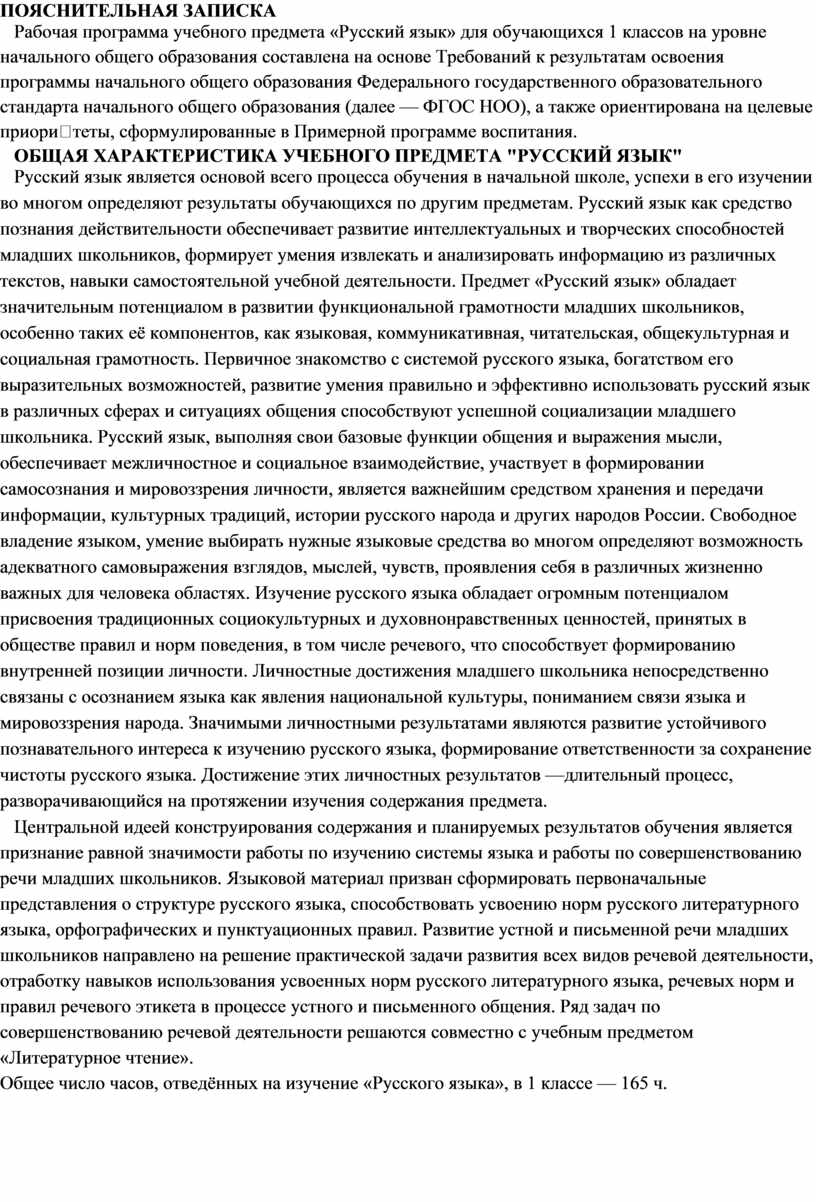 Рабочая программа учебного предмета «Русский язык» для обучающихся 1 классов на уровне начального общего образования составлена на основе Требований к результатам освоения программы начального общего образования Федерального государственного образовательного стандарта начального общего образования (далее — ФГОС НОО), а также ориентирована на целевые приори‐теты, сформулированные в Примерной программе воспитания.