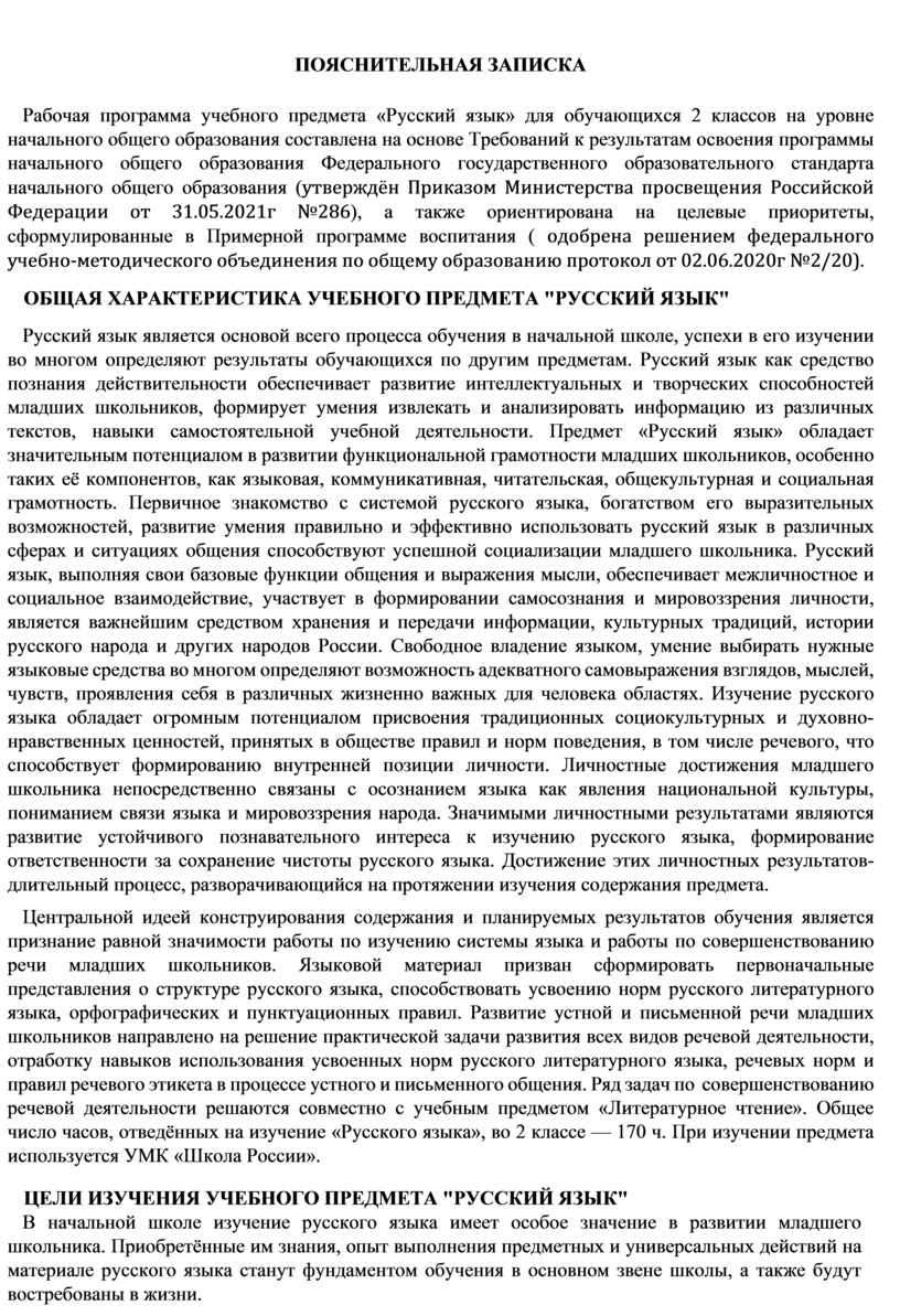 Рабочая программа учебного предмета «Русский язык» для обучающихся 2 классов на уровне начального общего образования составлена на основе Требований к результатам освоения программы начального общего образования Федерального государственного образовательного стандарта начального общего образования (утверждён Приказом Министерства просвещения Российской Федерации от 31.05.2021г №286), а также ориентирована на целевые приоритеты, сформулированные в Примерной программе воспитания ( одобрена решением федерального учебно-методического объединения по общему образованию протокол от 02.06.2020г №2/20).