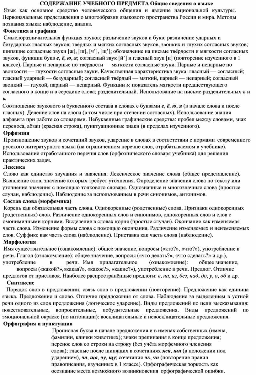 — овладение первоначальными научными представлениями о системе русского языка: фонетике, графике, лексике, морфемике, морфологии и синтаксисе; об основных единицах языка, их признаках и особенностях употребления в речи; использование в речевой деятельности норм современного русского литературного языка (орфоэпических, лексических, грамматических, орфографических, пунктуационных) и речевого этикета;