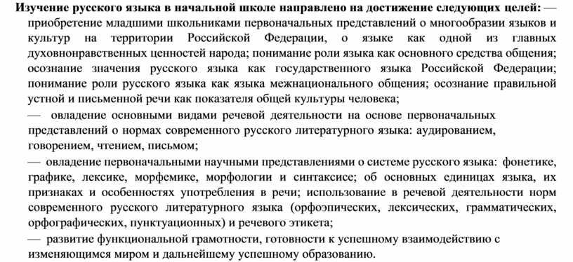 Изучение русского языка в начальной школе направлено на достижение следующих целей: — приобретение младшими школьниками первоначальных представлений о многообразии языков и культур на территории Российской Федерации, о языке как одной из главных духовнонравственных ценностей народа; понимание роли языка как основного средства общения; осознание значения русского языка как государственного языка Российской Федерации; понимание роли русского языка как языка межнационального общения; осознание правильной устной и письменной речи как показателя общей культуры человека;