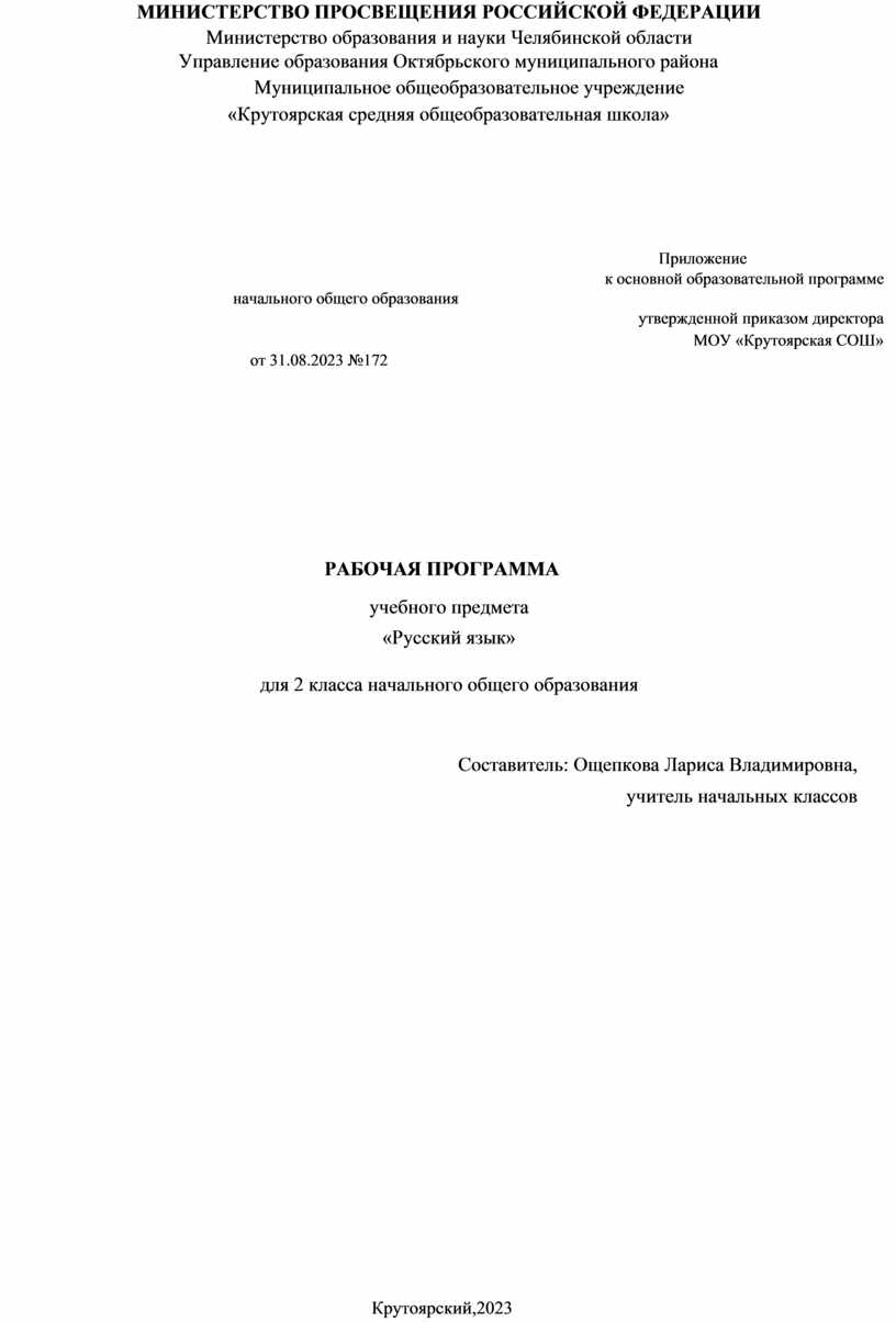 МОУ «Крутоярская СОШ» от 31.08.2023 №172