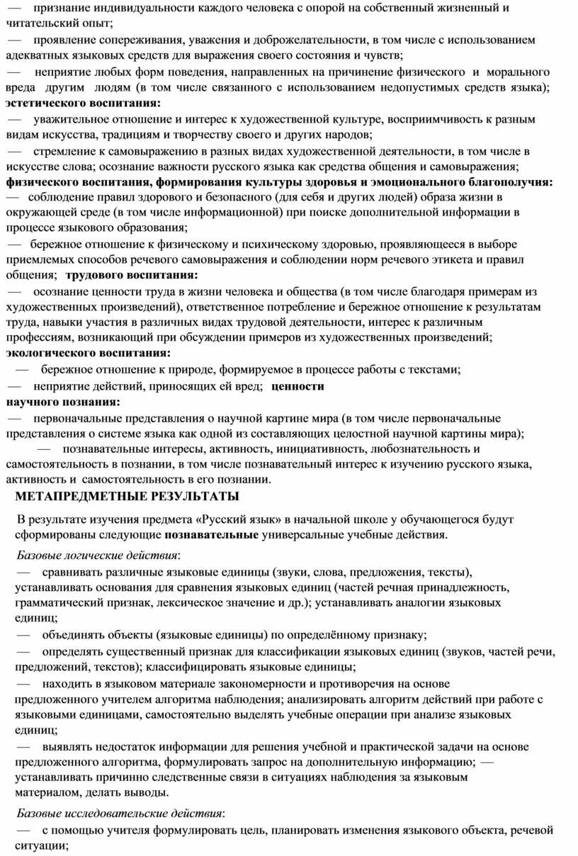 Русский язык является основой всего процесса обучения в начальной школе, успехи в его изучении во многом определяют результаты обучающихся по другим предметам. Русский язык как средство познания действительности обеспечивает развитие интеллектуальных и творческих способностей младших школьников, формирует умения извлекать и анализировать информацию из различных текстов, навыки самостоятельной учебной деятельности. Предмет «Русский язык» обладает значительным потенциалом в развитии функциональной грамотности младших школьников, особенно таких её компонентов, как языковая, коммуникативная, читательская, общекультурная и социальная грамотность. Первичное знакомство с системой русского языка, богатством его выразительных возможностей, развитие умения правильно и эффективно использовать русский язык в различных сферах и ситуациях общения способствуют успешной социализации младшего школьника. Русский язык, выполняя свои базовые функции общения и выражения мысли, обеспечивает межличностное и социальное взаимодействие, участвует в формировании самосознания и мировоззрения личности, является важнейшим средством хранения и передачи информации, культурных традиций, истории русского народа и других народов России. Свободное владение языком, умение выбирать нужные языковые средства во многом определяют возможность адекватного самовыражения взглядов, мыслей, чувств, проявления себя в различных жизненно важных для человека областях. Изучение русского языка обладает огромным потенциалом присвоения традиционных социокультурных и духовно-нравственных ценностей, принятых в обществе правил и норм поведения, в том числе речевого, что способствует формированию внутренней позиции личности. Личностные достижения младшего школьника непосредственно связаны с осознанием языка как явления национальной культуры, пониманием связи языка и мировоззрения народа. Значимыми личностными результатами являются развитие устойчивого познавательного интереса к изучению русского языка, формирование ответственности за сохранение чистоты русского языка. Достижение этих личностных результатов-длительный процесс, разворачивающийся на протяжении изучения содержания предмета.