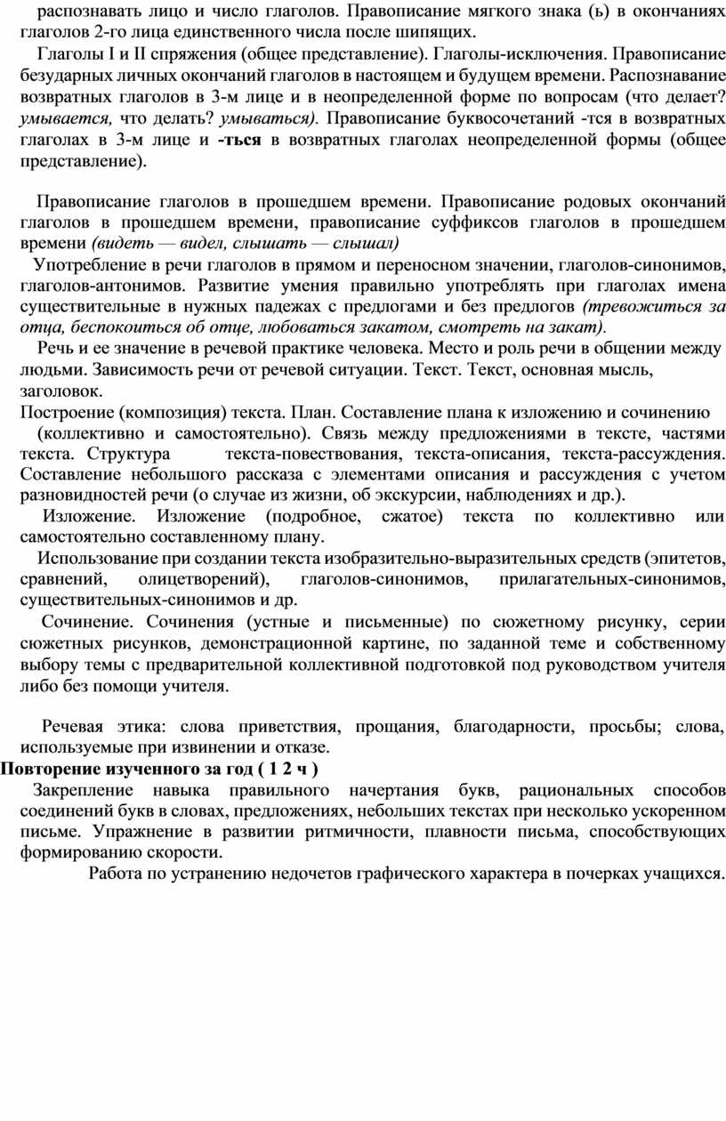 -определять грамматические признаки глаголов — число, время, род (в прошедшем времени), лицо (в настоящем и будущем времени), спряжение.