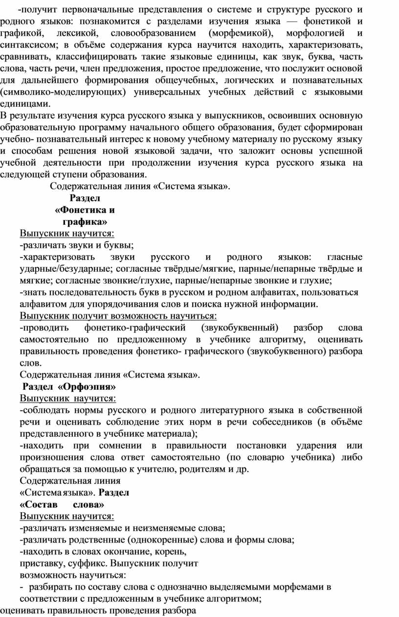 -получит первоначальные представления о системе и структуре русского и родного языков: познакомится с разделами изучения языка — фонетикой и графикой, лексикой, словообразованием (морфемикой), морфологией и синтаксисом; в объёме содержания курса научится находить, характеризовать, сравнивать, классифицировать такие языковые единицы, как звук, буква, часть слова, часть речи, член предложения, простое предложение, что послужит основой для дальнейшего формирования общеучебных, логических и познавательных (символико-моделирующих) универсальных учебных действий с языковыми единицами.