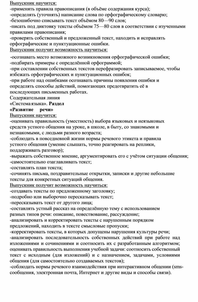 У выпускников, освоивших основную образовательную программу начального общего образования, будет сформировано отношение к правильной устной и письменной речи как показателям общей культуры человека. Они получат начальные представления о нормах русского литературного языка (орфоэпических, лексических, грамматических) и правилах речевого этикета, научатся ориентироваться в целях, задачах, средствах и условиях общения, что станет основой выбора адекватных языковых средств для успешного решения коммуникативной задачи при составлении несложных устных монологических высказываний и письменных текстов. У них будут сформированы коммуникативные учебные действия, необходимые для успешного участия в диалоге: ориентация на позицию партнёра, учёт различных мнений и координация различных позиций в сотрудничестве, стремление к более точному выражению собственного мнения и позиции, умение задавать вопросы.