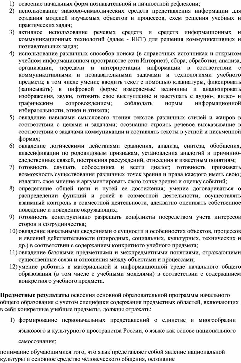 Предметные результаты освоения основной образовательной программы начального общего образования с учетом специфики содержания предметных областей, включающих в себя конкретные учебные предметы, должны отражать: