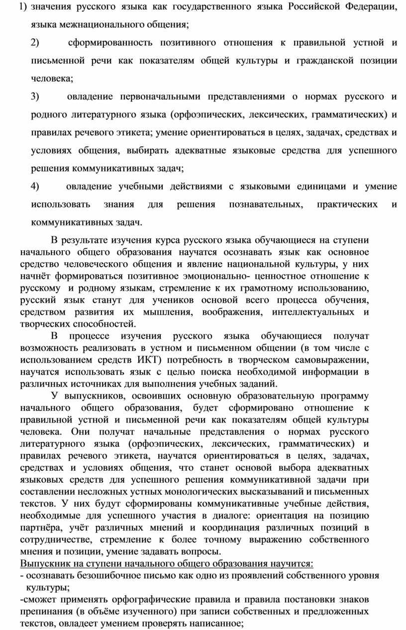 В результате изучения курса русского языка обучающиеся на ступени начального общего образования научатся осознавать язык как основное средство человеческого общения и явление национальной культуры, у них начнёт формироваться позитивное эмоционально- ценностное отношение к русскому и родному языкам, стремление к их грамотному использованию, русский язык станут для учеников основой всего процесса обучения, средством развития их мышления, воображения, интеллектуальных и творческих способностей.