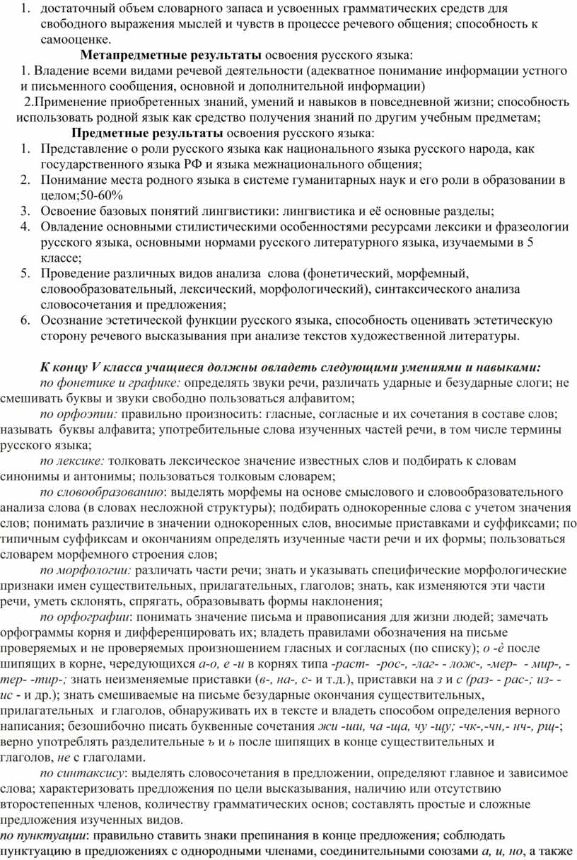 -освоение знаний об устройстве языковой системы и закономерностях её функционирования, развитие способности опознавать, анализировать, сопоставлять, классифицировать и оценивать языковые факты, обогащение активного словарного запаса, расширение объема используемых в речи грамматических средств, совершенствование орфографической и пунктуационной грамотности, развитие умений стилистически корректного использования лексики и фразеологии русского языка;