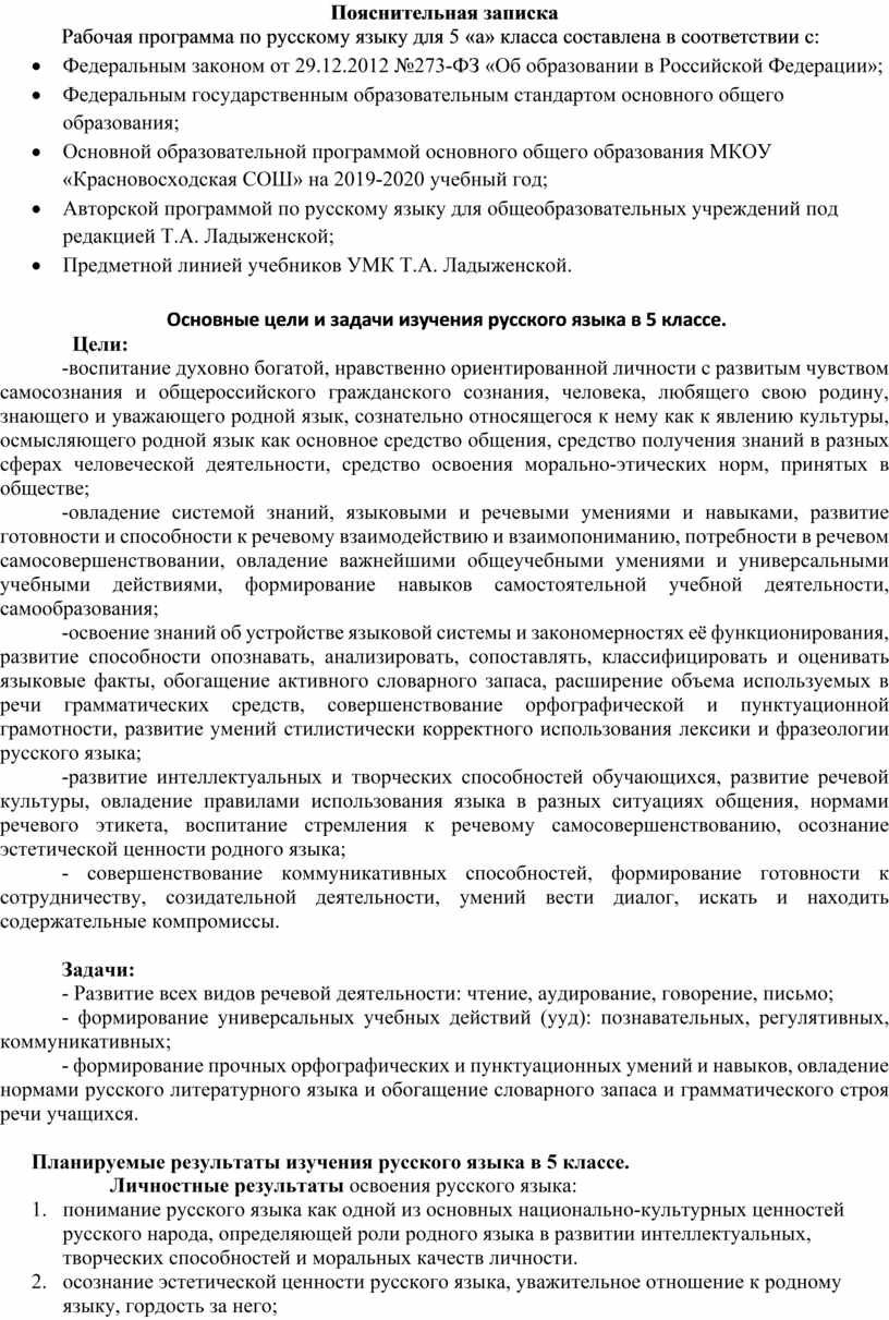 Рабочая программа по русскому языку для 5 «а» класса составлена в соответствии с: