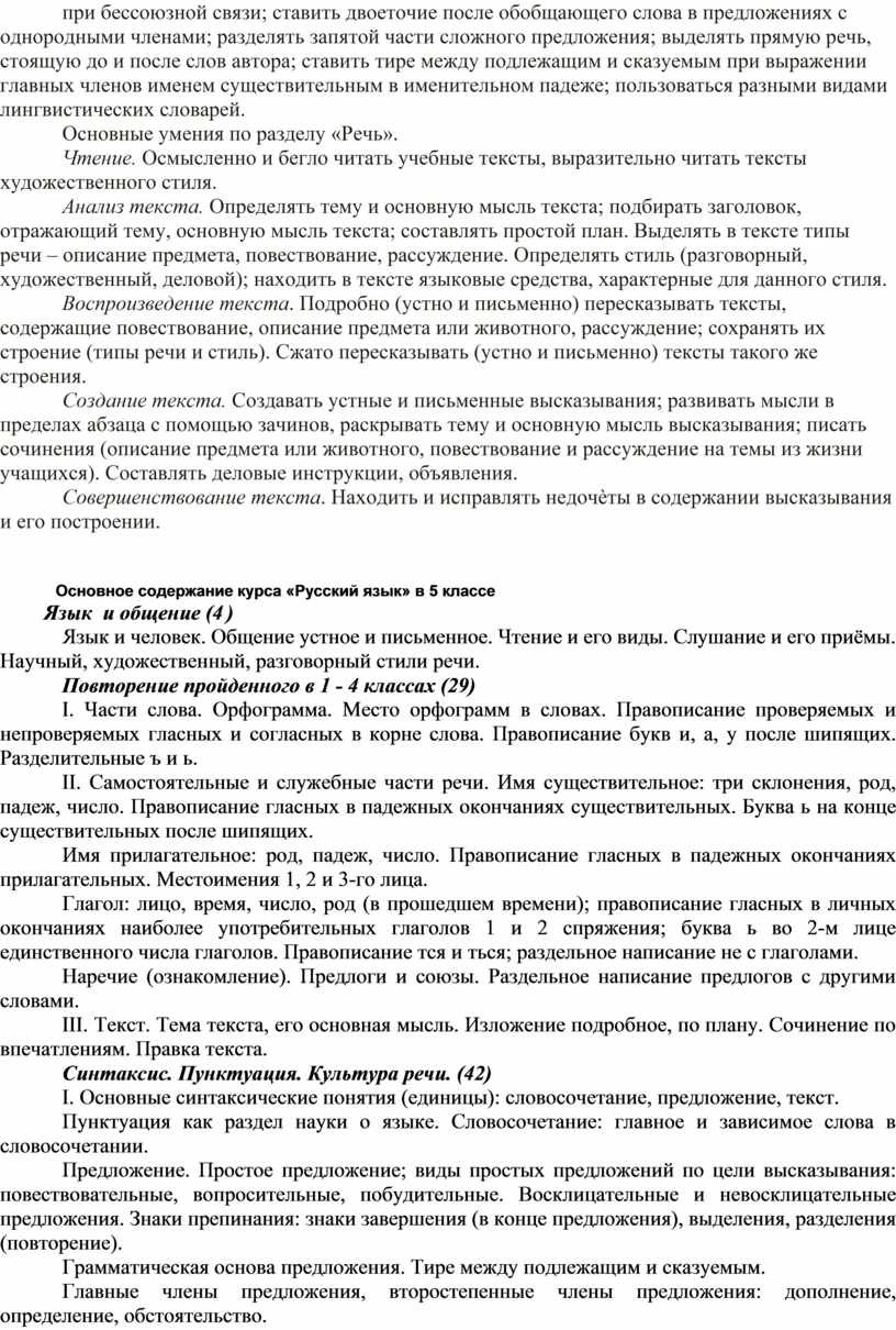 Основное содержание курса «Русский язык» в 5 классе