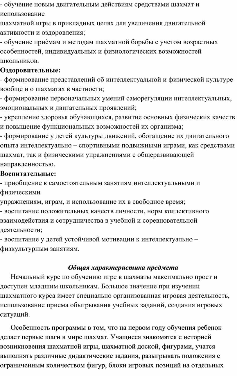 2. формирование основ здорового образа жизни и их интеллектуальное развитие посредством занятий шахматами и физической культурой.
